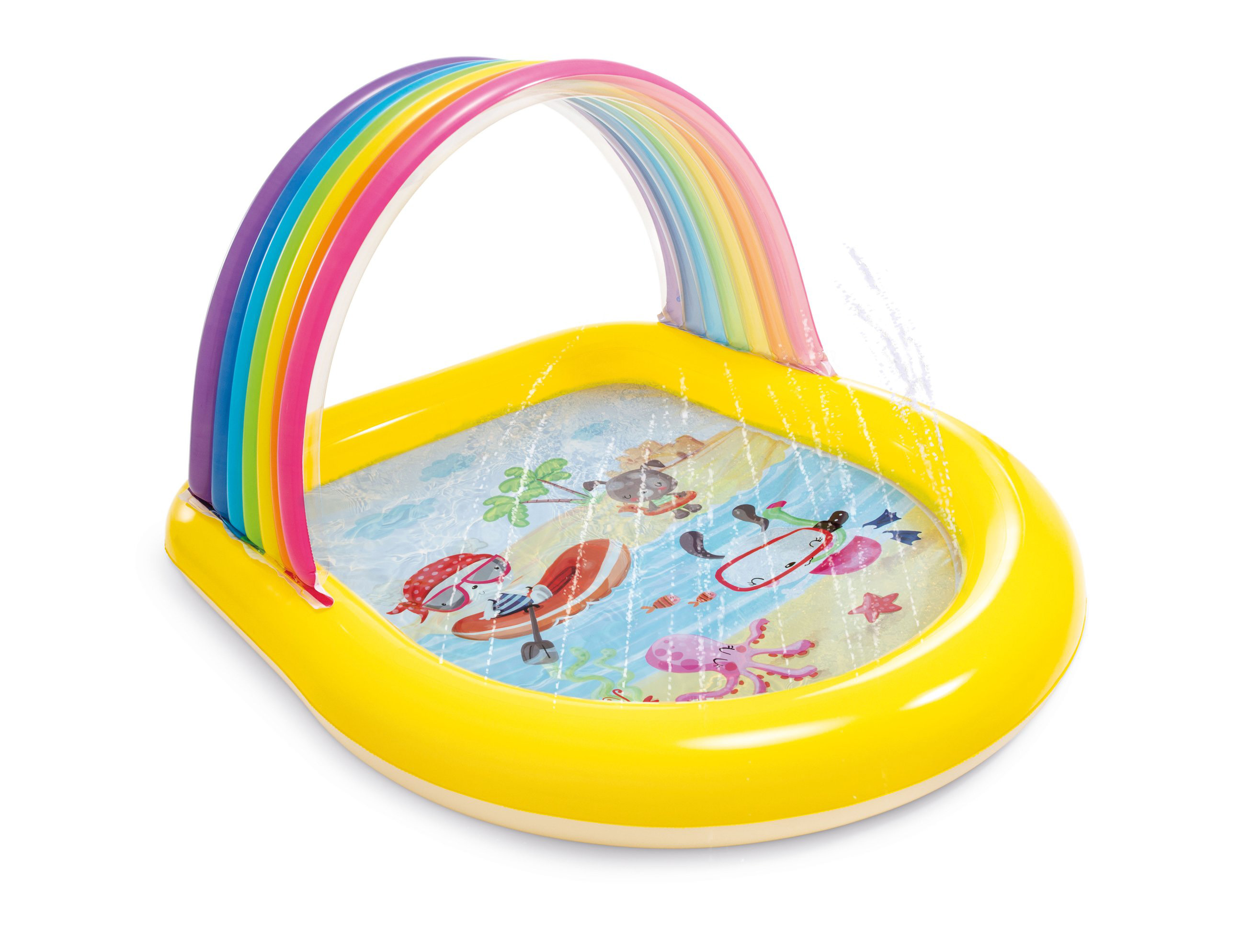 Bazén s duhou a s rozprašovačem vody. Velikost 147 x 130 x 86 cm, 0,25 mm vinyl, objem 84 l při výšce hladiny 10 cm, opravný set