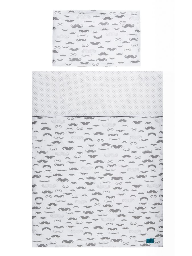Dětská bavlněná 6-dílná souprava do postýlky Belisima Little Man pro miminka. Soupravu zdobí originální obrázký knírů a příjemné barvy. Je vyrobena z měkkého, příjemného materiálu. Souprava obsahuje povlečení na polštářek cca 40x60 cm, povlečení na peřinku cca 100x135 cm, mantinel cca 180 cm, výplň polštářek a peřinka, nebesa. Materiál 100% bavlna.