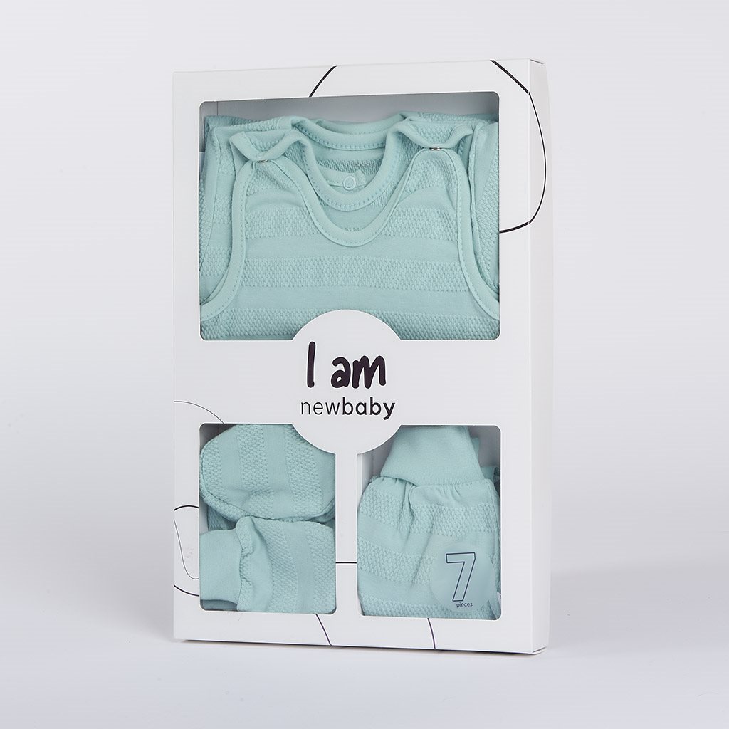 Roztomilá kojenecká 7-dílná soupravička české značky New Baby I AM pro miminka. Soupravička je vyrobena z velmi příjemného, měkkého a kvalitního materiálu, který je vhodný pro miminka a je vhodná nejen do porodnice. Obsahuje celorozepínací body s dlouhým rukávkem, dupačky, polodupačky, kabátek, čepičku, rukavičky a capáčky. Body má boční zapínání po celé délce a mezi nožičkama na cvočky. Dupačky mají zapínání na cvočky na ramínkách a mezi nožičkama, coš usnadní oblékání a přebalování. Kabátek má zapínání na cvočky po celé délce. Čepička s širším lemem dobře drží na hlavičce miminka a nepadá. Je velmi praktická a netlačí na hlavičku miminka. Rukavičky a capáčky mají širší stahovací manžetku. Celá soupravička má nový neobyčejný design s atraktivním vzorem látky. Je navržena s ohledem na potřeby miminka a je vhodná i jako milý dáreček. Soupravička je v praktické Eko krabičce. Složení: 100% bavlna.
