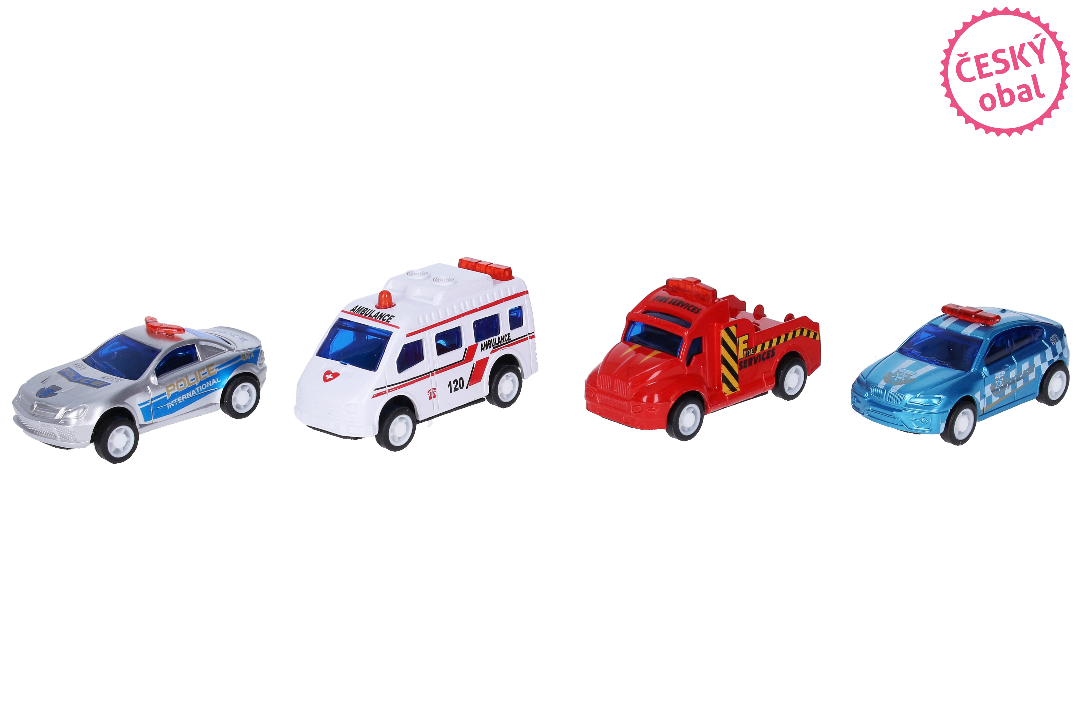Sada autíček - akce na dálnici. Délka 7 cm. Balení obsahuje 4 ks. Pohon na zpětné natažení.