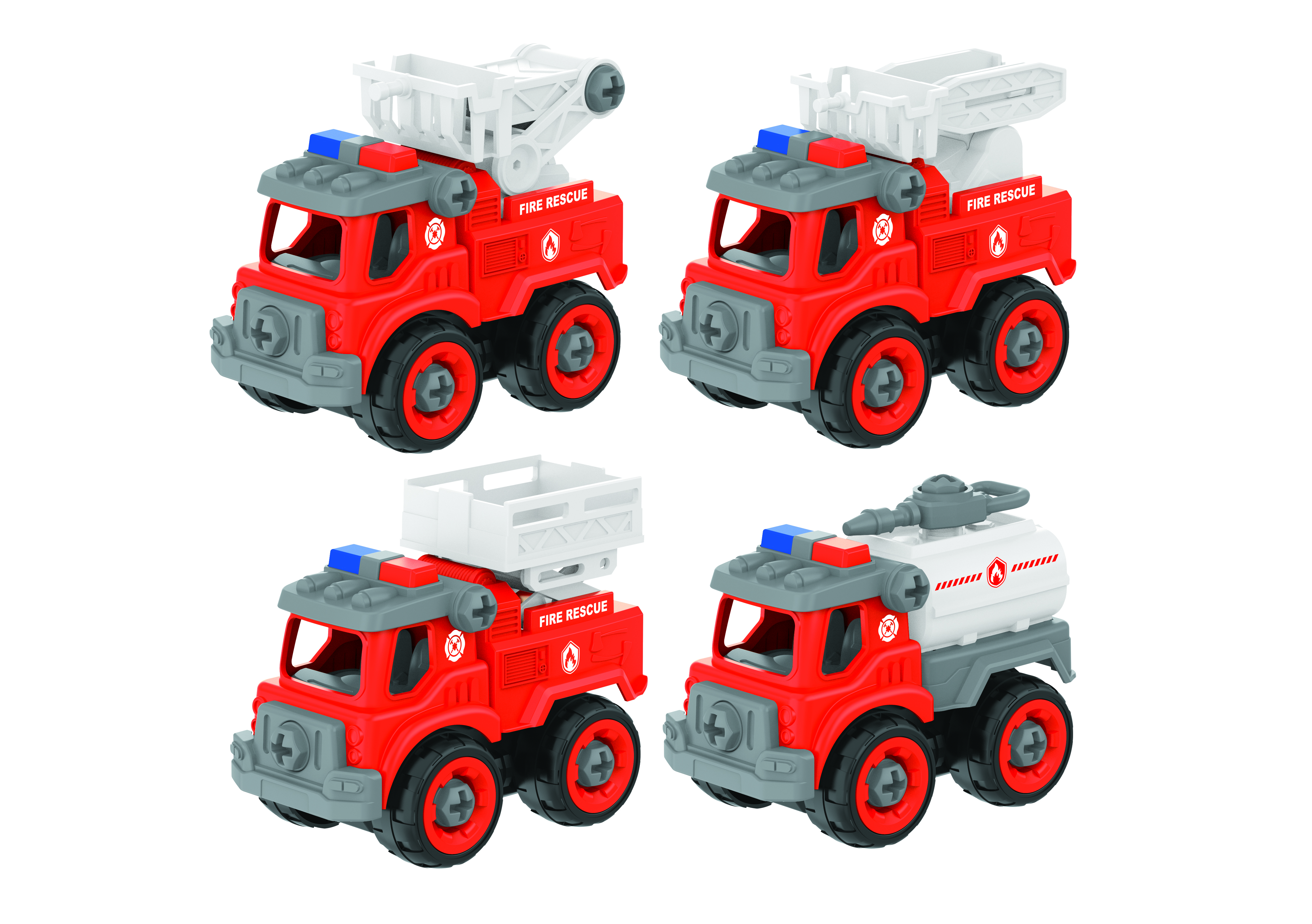 Auto šroubovací hasičské 4 ks. Velikost 13 cm. Volná kola. V balení - 4 auta, náklad, šroubovák.