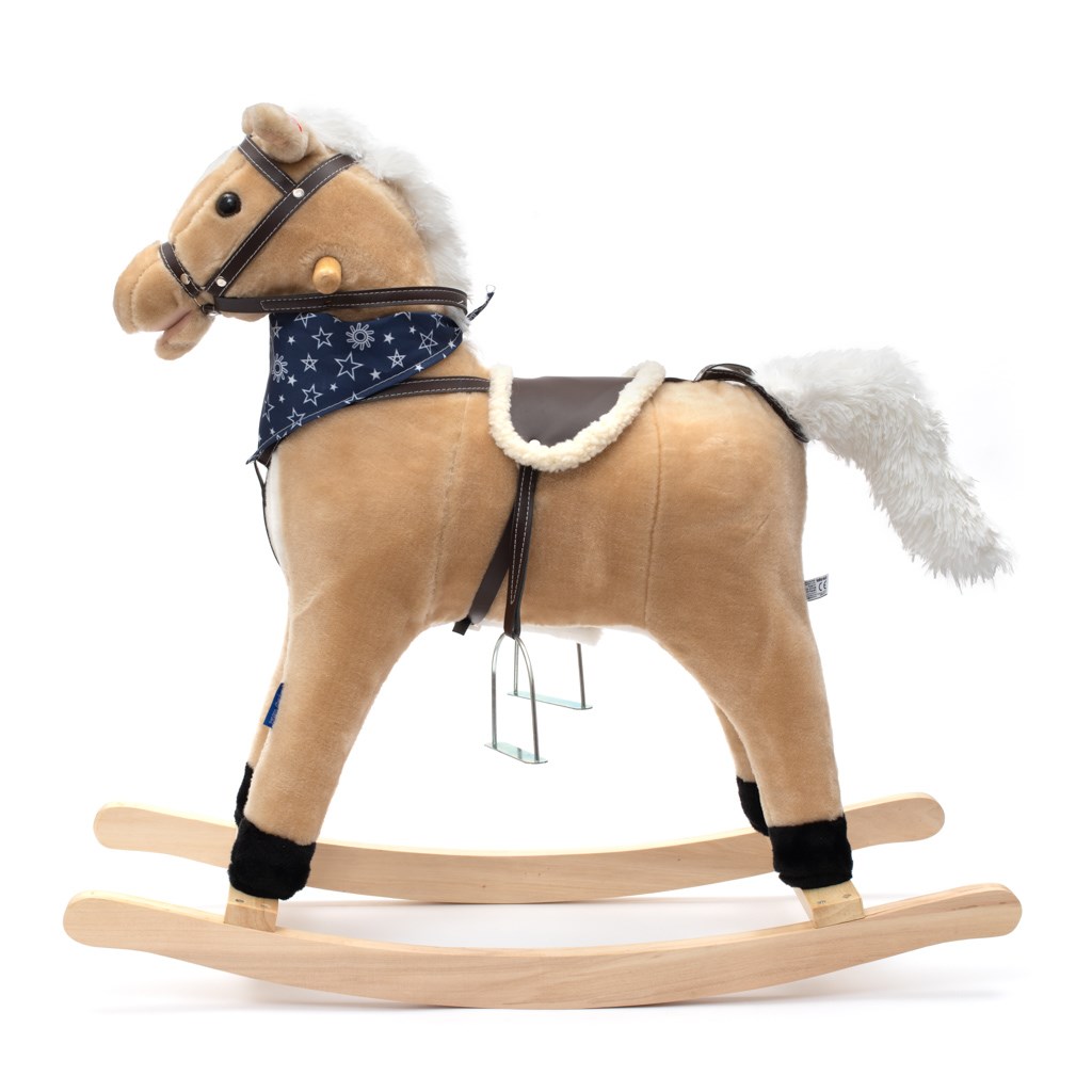 Měkoučký houpací koník Baby Mix byl navržen pro děti, které mají rády dobrodružství. Vypadá jako opravdový, takže se vaše dítě bude cítit jako skutečný jezdec. Koník je vyroben z měkkého plyše, kolem krku má ozdobný šátek a je vybaven dřevěnými houpacími lištami, jejichž profil chrání dítě před převrácením. Pohodlné sedlo, pevná uzda, kovové třmeny, dřevěné rukojeti a stabilní houpací lišty zajistí vašim kovbojům ještě větší stabilitu a pohodlí během houpání. Je vyroben z měkkého plyšového materiálu, pevné dřevěné lišty nebo rukojeti lze snadno odšroubovat. Po stisknutí tlačítek na ouškách koník vrtí ocáskem, hýbe tlamičkou, ozvou se zvuky cvalu, koník zařehtá a zazpívá kovbojskou písničku. Tři potřebné baterie AA 1,5 V se vkládají do pouzdra umístěného na bříšku koníka a nejsou součástí balení. Během houpání se dítě učí koordinovat pohyby svého těla s koníkem, což zlepšuje celkovou rovnováhu a motoriku dítěte.