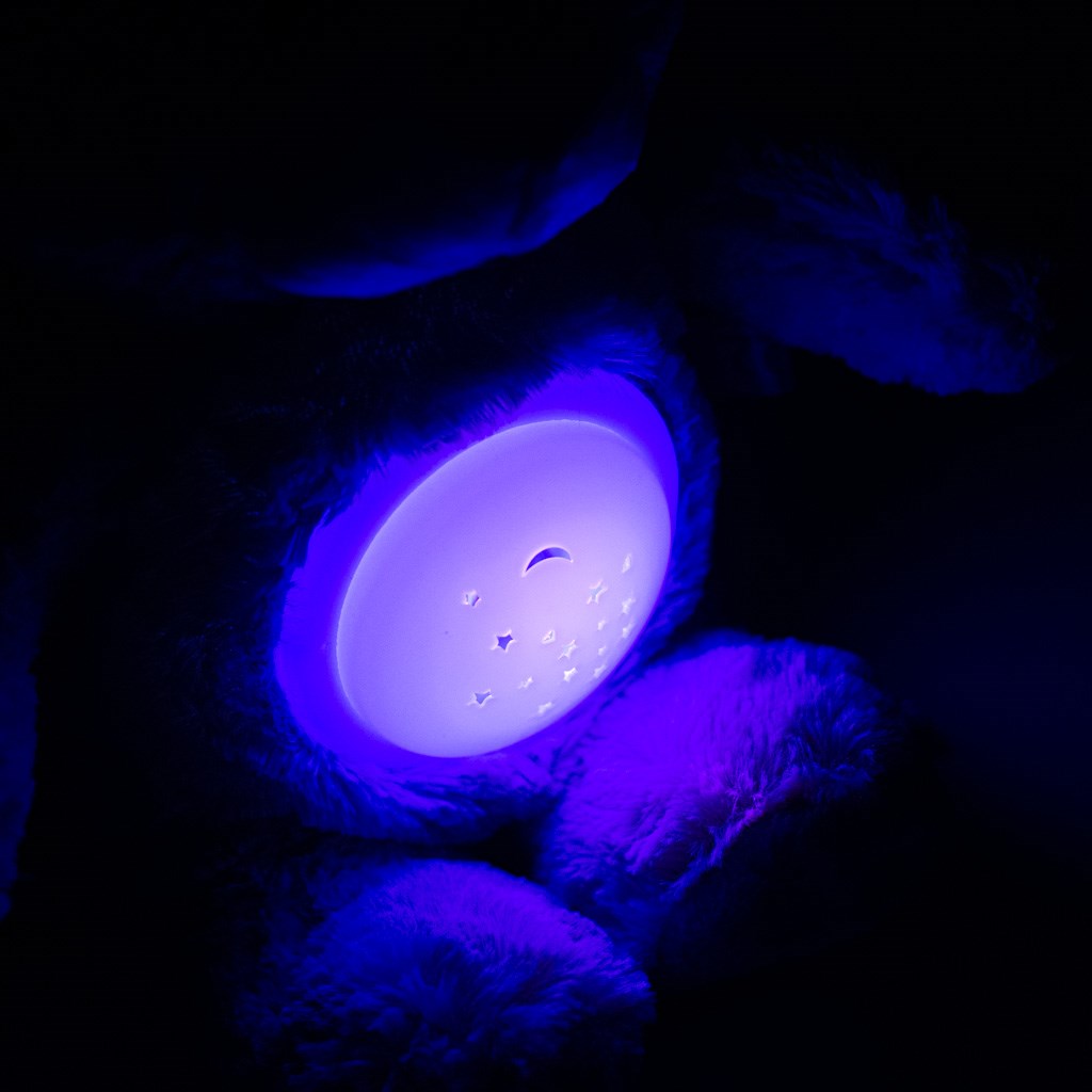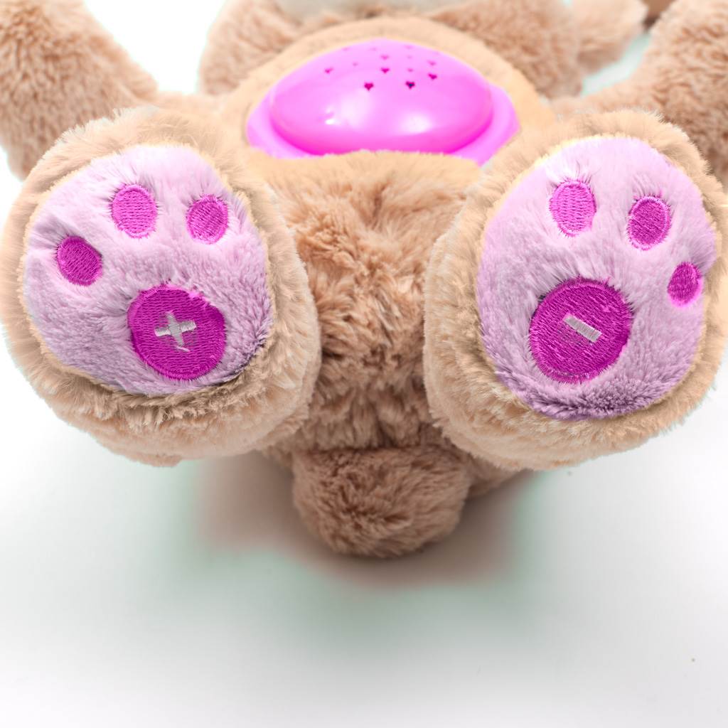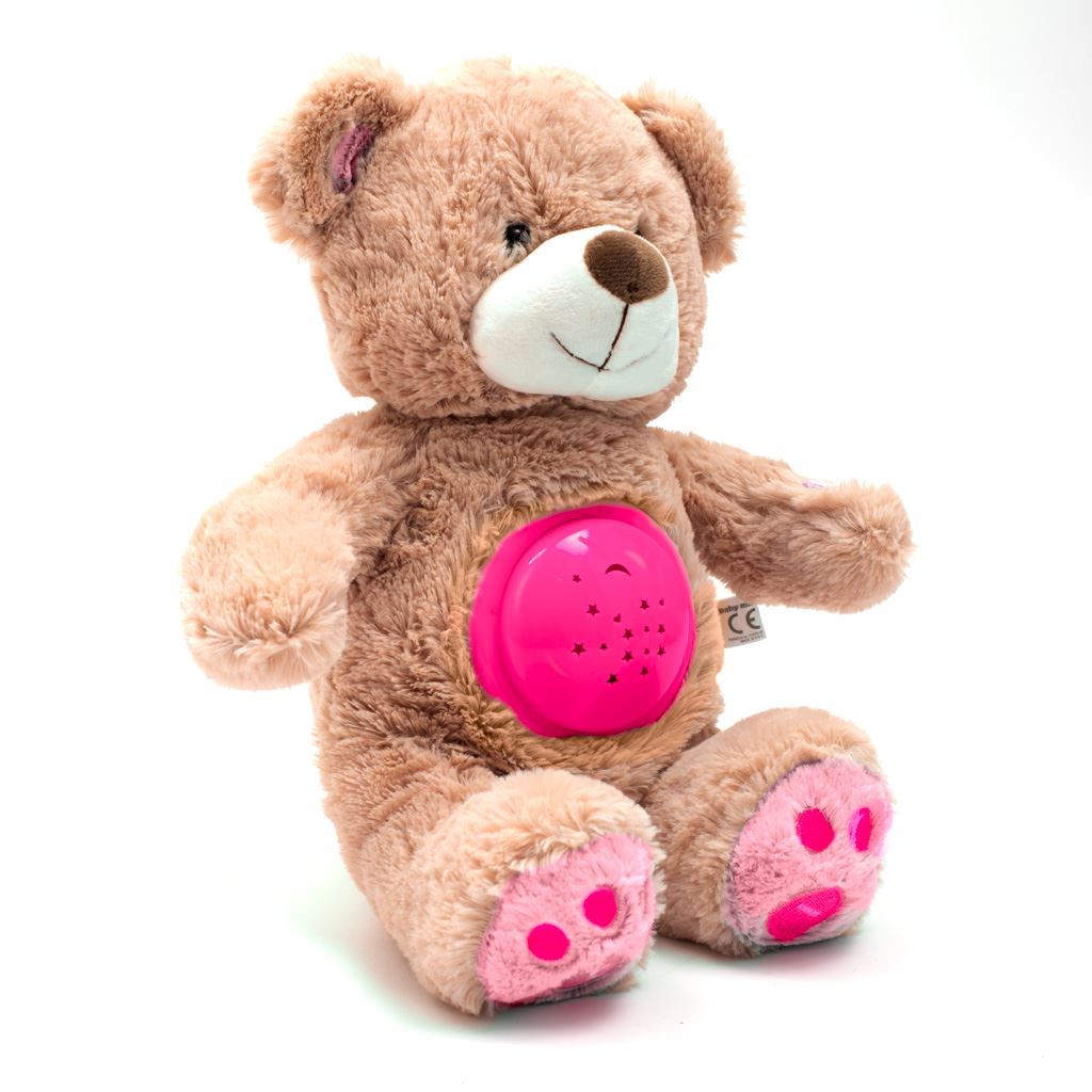 Roztomilý plyšový medvídek s projektorem Baby Mix. Hračka je vyrobena z měkké plyšové látky a je velmi příjemná na dotek. Malým dětem zpříjemní usínání. Po stisknutí tlačítka umístěného na tlapce zapnete světýlko které mění barvu a poslouží jako maličká noční lampička a zároveň se spustí jemné melodie. Dítě může poslouchat jemnou ukolébavku. Medvídka si aktivujete pomocí tlačítka on / off, který je ukrytý v zádíčkách medvídka. Modul je na baterie. Baterie jsou součástí balení. 3x Typ AA 1,5 V. Hračka je vhodná pro děti od 6 měsíců. Rozměry: cca 34 cm.