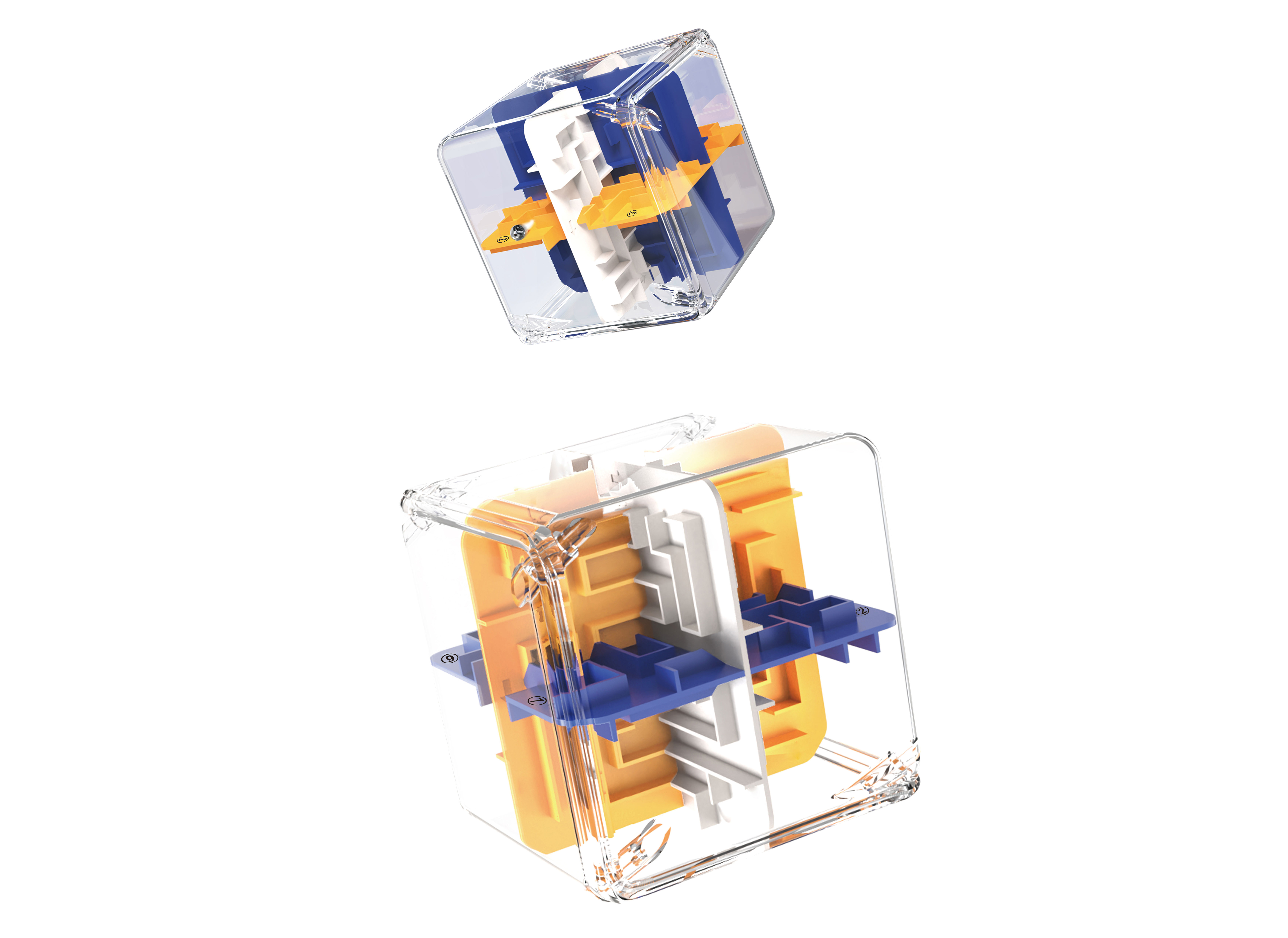 Bludiště 3D kostka barevná. Velikost 9cm. Cílem je dostat kuličku do jamky. Lze postupovat podle číslic na jednotlivých stěnách.