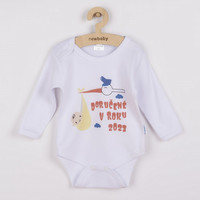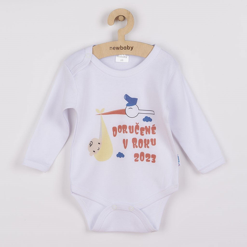 Originální bavlněné kojenecké body s dlouhým rukávem New Baby, s vtipným nápisem DORUČENÉ V ROKU 2023. Barvy použité k potisku jsou certifikované a vhodné pro miminka. Je vyrobeno z příjemného a kvalitního materiálu, ve kterém se bude Vaše miminko cítit příjemně. Body má zapínáni na cvočky na ramínku a mezi nožičkami, což usnadňuje oblékání a přebalování. Dopřejte Vašemu miminku vyniknout v originálním body. Složení: 100% bavlna. Rozměry: obvod kolem hrudníku cca 34 cm, délka rukávu cca 16 cm, celková délka cca 30 cm.