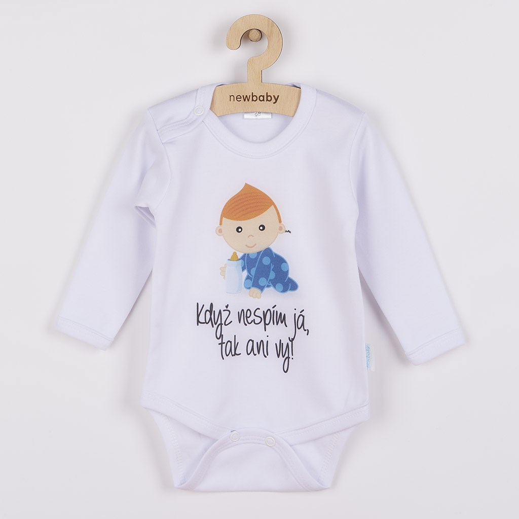 Originální bavlněné kojenecké body s dlouhým rukávem New Baby, s vtipným nápisem Když nespím já, tak ani vy! A obrázkem roztomilého chlapečka. Body má kolem krčku, nožiček a ručiček barevné lemování. Barvy použité k potisku jsou certifikované a vhodné pro miminka. Je vyrobeno z příjemného a kvalitního materiálu, ve kterém se bude Vaše miminko cítit příjemně. Body má zapínáni na cvočky na ramínku a mezi nožičkami, což usnadňuje oblékání a přebalování. Dopřejte Vašemu miminku vyniknout v originálním body. Složení: 100% bavlna. Rozměry: obvod kolem hrudníku cca 42 cm, délka rukávu cca 23 cm, celková délka cca 38 cm.