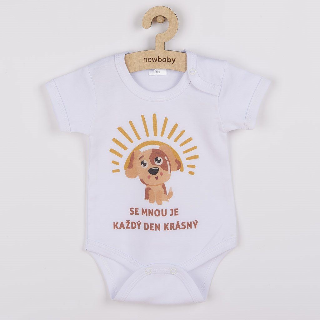 Originální bavlněné kojenecké body s krátkým rukávem New Baby s nápisem SE MNOU JE KAŽDÝ DEN KRÁSNÝ a obrázkem. Barvy použité k potisku jsou certifikované a vhodné pro miminka. Je vyrobeno z příjemného a kvalitního materiálu, ve kterém se bude Vaše miminko cítit příjemně. Body má zapínáni na cvočky na ramínku a mezi nožičkami, což usnadňuje oblékání a přebalování. Dopřejte Vašemu miminku vyniknout v originálním body. Složení: 100% bavlna.