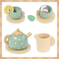 Materiál: přírodní dřevo + melamin (nádobí) a dřevo (příbory); podnos a podložky z překližky; doplňky z překližky + netkaná textilie + polyester; patéra z MDF + překližka + dřevěné produkty