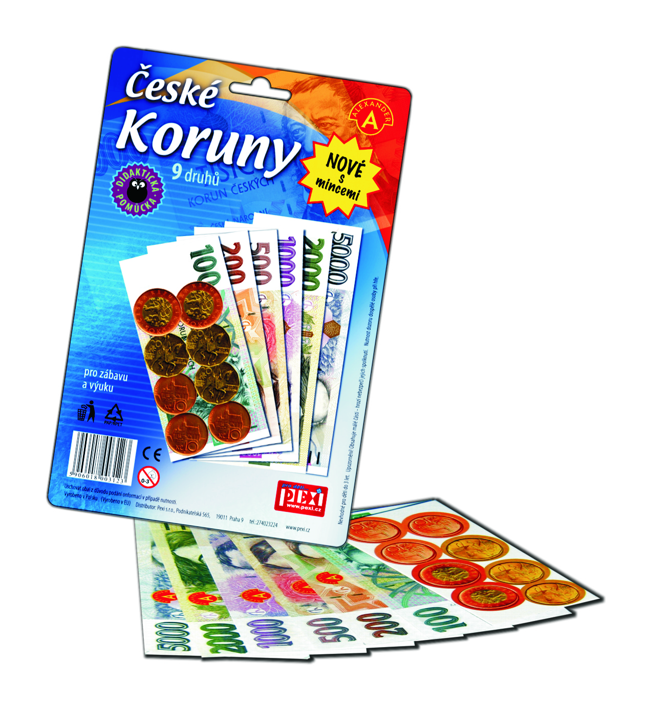 6 druhů velkých a sytě barevných českých bankovek a k tomu ještě mince 10, 20 a 50 Kč. 149.340,-Kč v jednom balíčku! Vhodné k různým dětským hrám a jako naučná pomůcka.