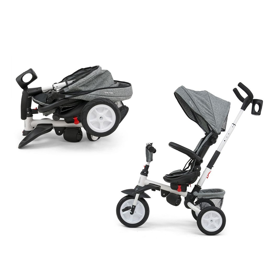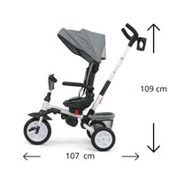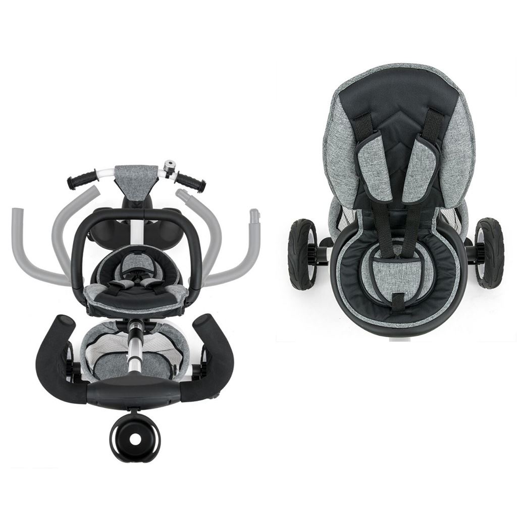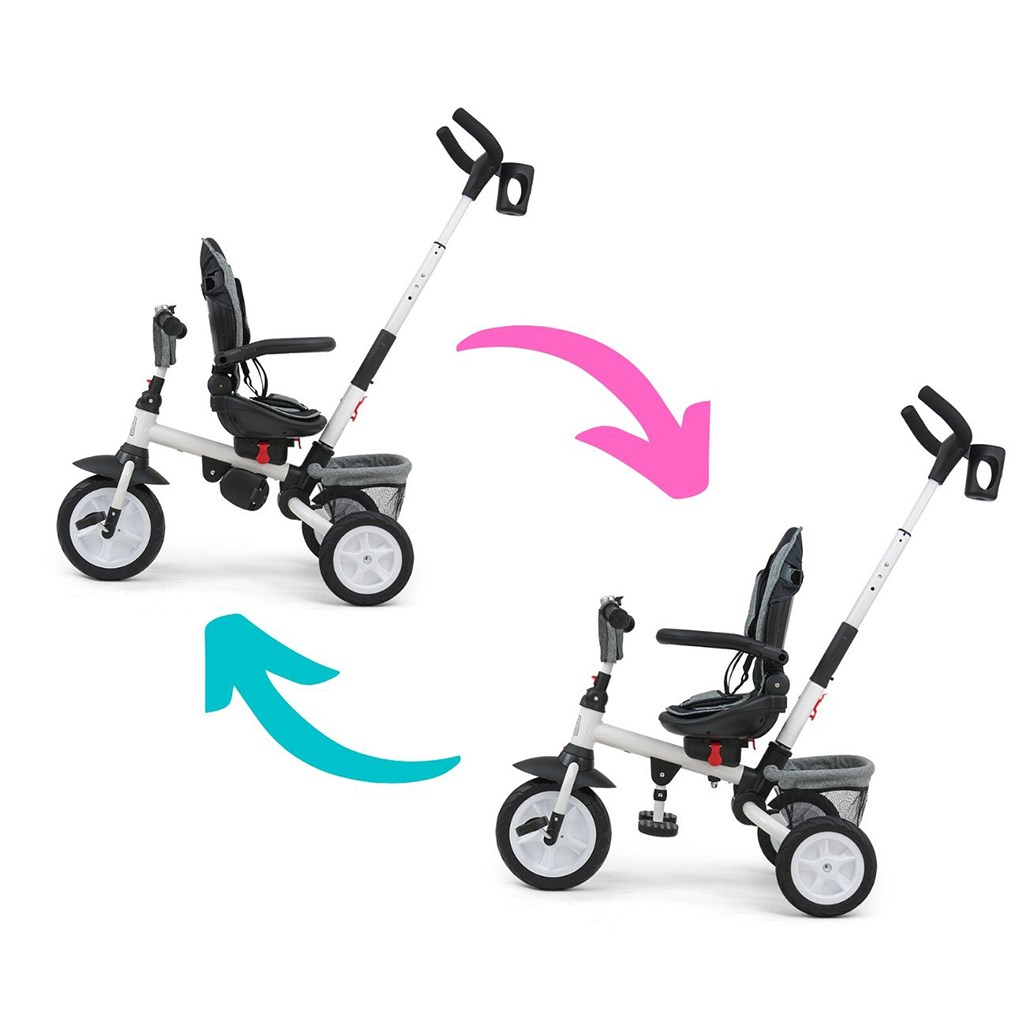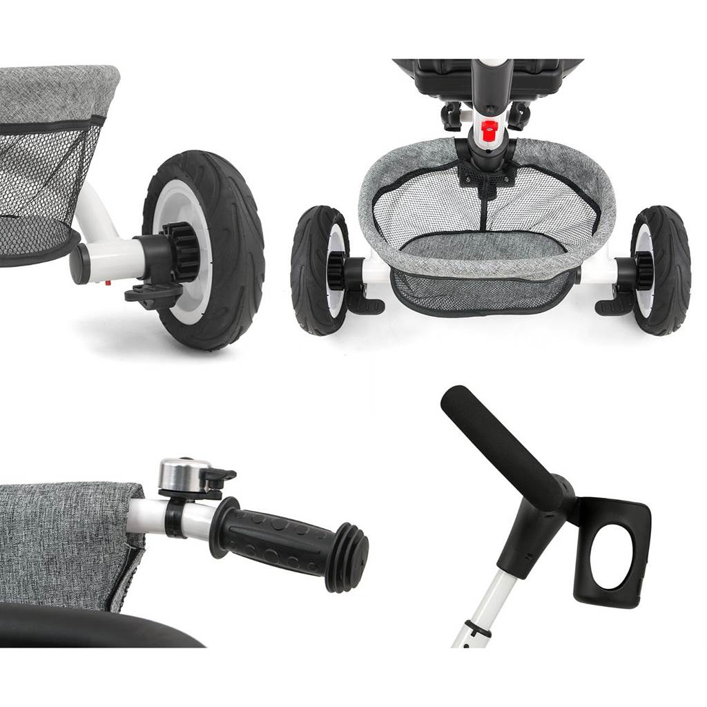 Je vyrobena z kvalitních a odolných materiálů. Má moderní konstrukci, pohodlné a ergonomicky tvarované sedadlo, které je otočné o 360 stupňů, což umožní dítěti cestovat ve směru nebo proti směru jízdy. O pohodlí a bezpečí během jízdy se stará bariérka, tříbodové bezpečnostní pásy, pohodlné stupačky nebo gumová kola, které skvěle absorbují rázy a poskytují dobrou přilnavost. Tříkolku může ovládat jak dítě, tak i rodič pomocí nastavitelné rukojeti pro tlačení. Po odebrání vodící tyče, sklápěcí stříšky, která chrání před sluncem nebo ostatních komponent bude sloužit jako tříkolka. Tříkolku lze používat rovněž jako alternativu golfového kočárku. Pro uložení hraček nebo potřeb pro dítě je zde praktický úložný košík.