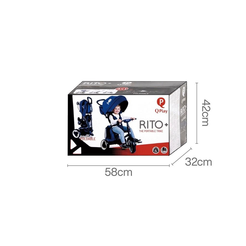 RITO PLUS je stabilní a bezpečná, má moderní design a pohodlně tvarované sedadlo. Tříkolka je vybavena bezpečnostní bariérkou, která nedovolí aby dítěvypadlo, pětibodovým bezpečnostním pásem, opěrkami nohou. Pěnová kola zajišťují tichou a pohodlnou jízdu. Po odstranění vodící tyče, bariérky, stříšky a potahu sedadla lze RITO PLUS používat jako klasickou tříkolku. Díky funkci "volné kolo a řídítka" může dítě volně šlapat a zatáčet, zatímco rodič má plnou kontrolu nad směrem a rychlostí jízdy. Kombinace kovové konstrukce, pěnových kol EVA a kvalitních plastů zaručuje odolnost a pohodlí.