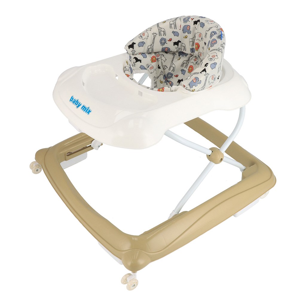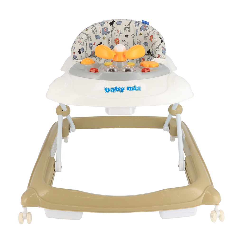 Multimediální chodítko Baby Mix se silikonovými kolečky. Chodítko je vybaveno pohodlným ergonomicky tvarovaným sedadlem, které zajišťuje správné držení páteře. Multimediální panel obsahuje různé světelné efekty, troubící volant, kterým lze otáčet, tlačítka pro přehrávání melodií a dvě světla. Krásné chodítko s hračkami okouzlí malé objevitele a umožní jim hrát si ještě déle. Chodítko je vybaveno speciálním systémem proti převrácení, který zajistí Vašemu dítěti pohodlí a bezpečnost.