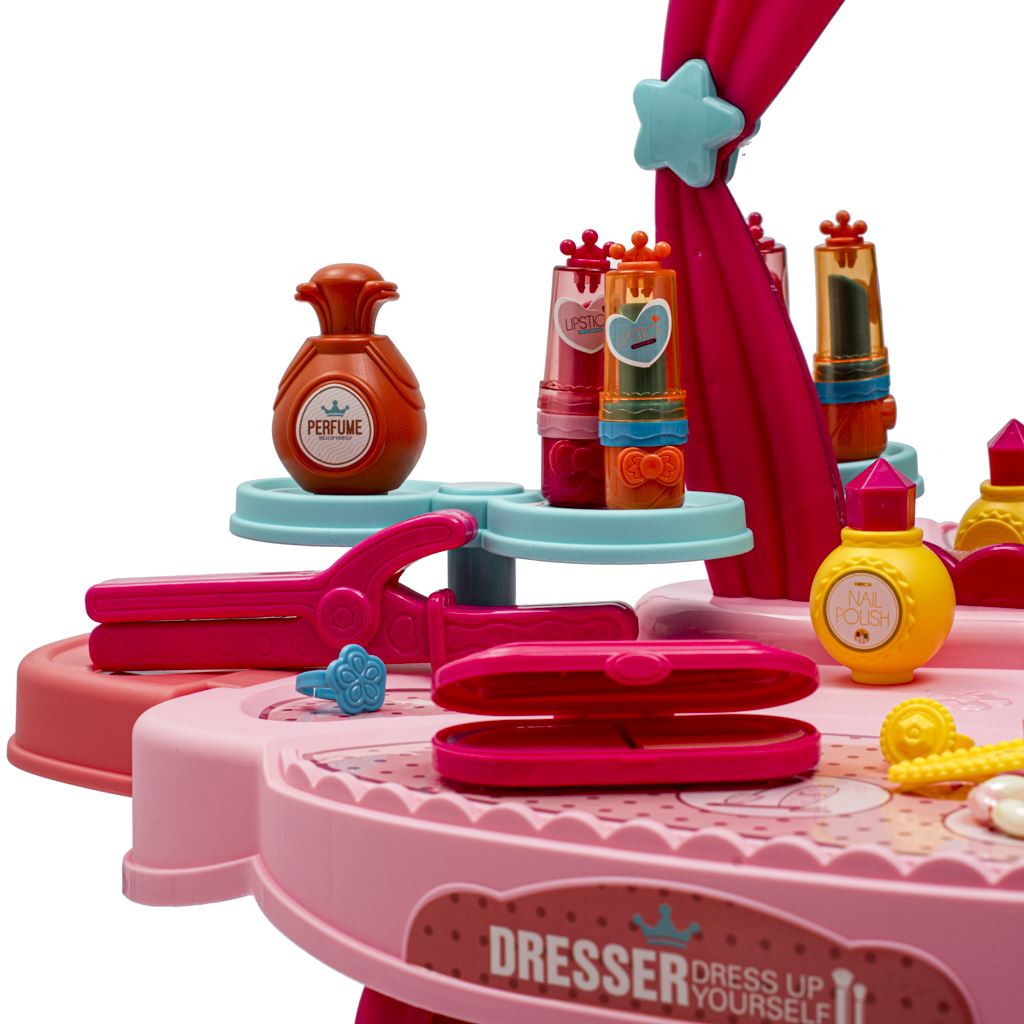 Dětský kosmetický stolek je určen pro děti od 3 let. Toaletní stoleček má zvukové efekty, dodává se s maketami kosmetiky a jeho součástí je i židlička.