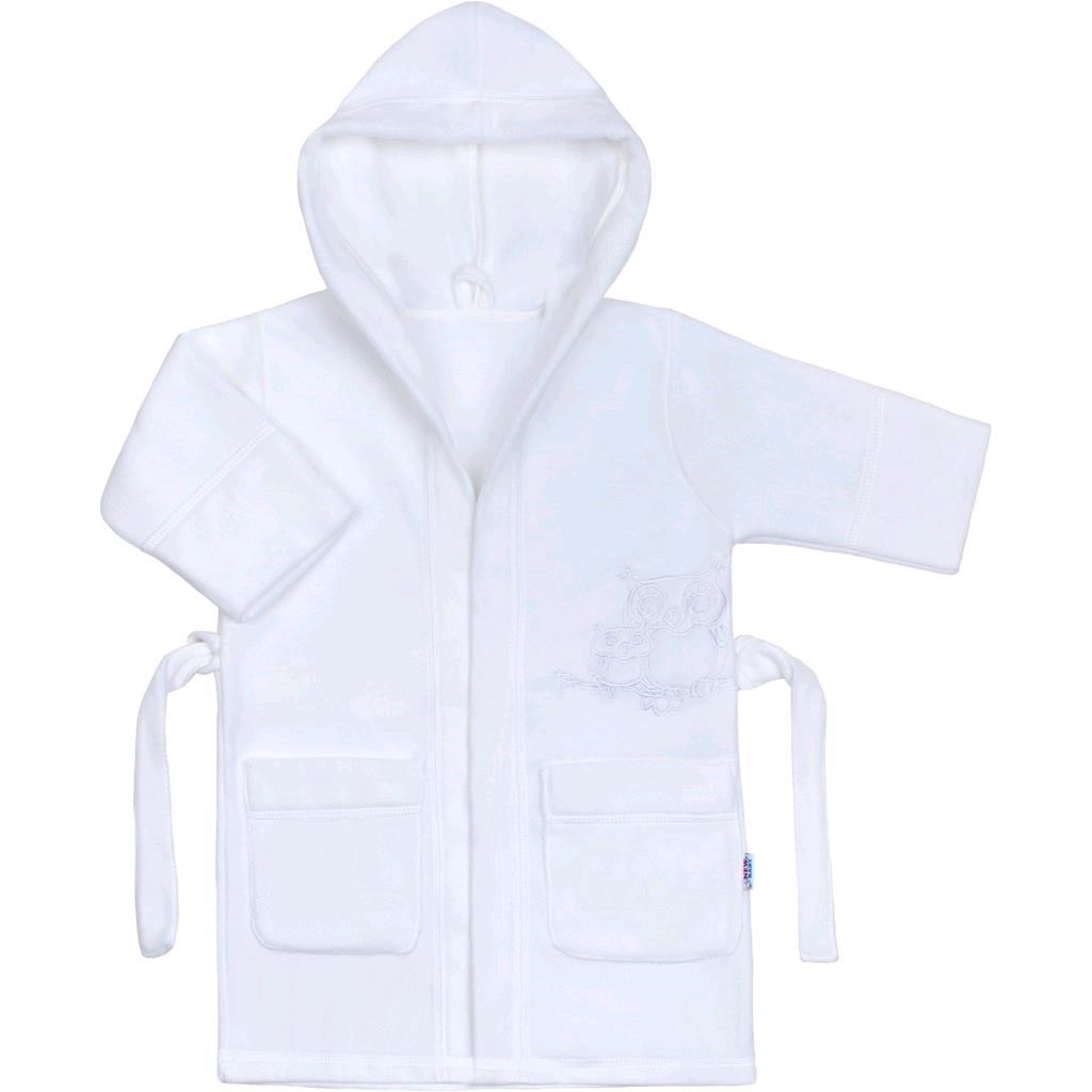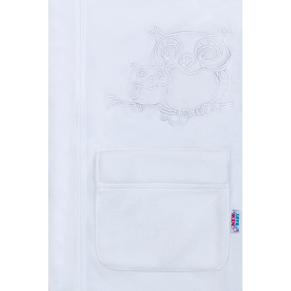 Nádherný dětský župan New Baby Sovičky. Župan je vyroben z příjemného a hřejivého materiálu. Župan zdobí obrázek soviček, kapuce a dvě kapsy. Kapucka chrání mokrou hlavičku před chladem a měkký, teplý materiál je ideální pro citlivou dětskou pokožku. Dětský župan se zavazuje na šňůrky. Ideální nejen po koupeli, ale také po koupání v bazénu či v moři. Rozměr: délka od ramínek cca 68 cm, obvod kolem hrudníku cca 82 cm, délka rukávu cca 35 cm. Složení 100% polyester.