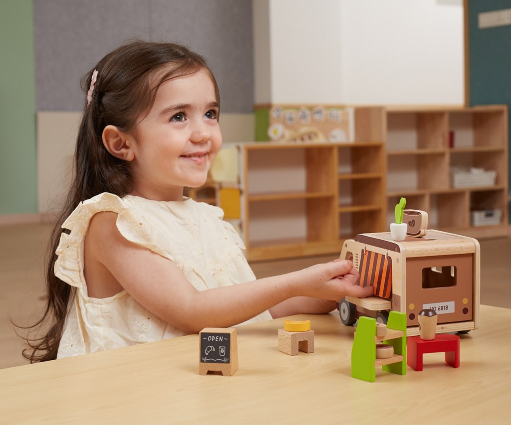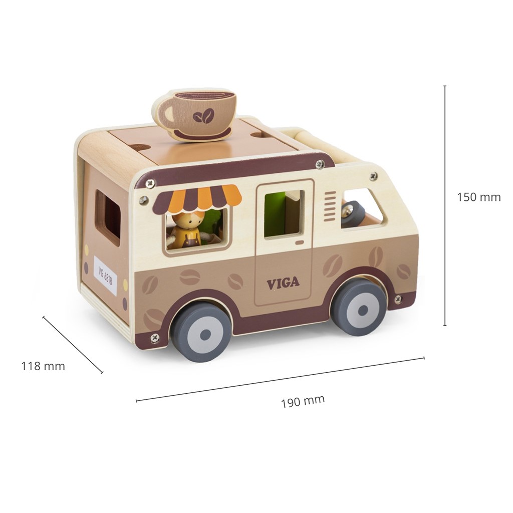 Pevná dřevěná konstrukce a jemné pastelové barvy nanesené netoxickými barvami činí hračku nejen esteticky příjemnou, ale i bezpečnou pro nejmenší. Sada je navržena s ohledem na rozvoj představivosti, manuálních dovedností a sociálních schopností dětí a nabízí mnoho hodin kreativní zábavy. Perfektní pro děti, které milují dobrodružství a sní o vlastní mobilní kavárně na kolech.