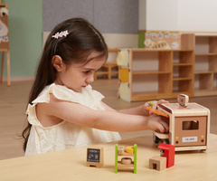 Dřevěná mobilní kavárnička je mimořádně kreativní a pečlivě zpracovaná hračka, která děti přivádí do fascinujícího světa kavárenských dobrodružství. Díky realistickým prvkům mohou děti vystoupit v roli baristy a obsluhovat své „zákazníky“, což činí hru velmi poutavou. Kavárnička nejen baví, ale také podporuje rozvoj dítěte v mnoha směrech: rozvíjí fantazii, motoriku i sociální dovednosti. Hra na přípravu kávy a podávání pokrmů rozvíjí empatii i komunikační schopnosti a učí děti interakci v různých situacích.