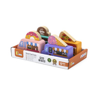 Čtyři Food Trucky mají možnost připevnit na střechu prvek s obrázkem vhodným pro kavárnu, zmrzlinárnu, cukrárnu a pizzerii. Dřevěná autíčka jsou ideální pro hru uvnitř i venku.