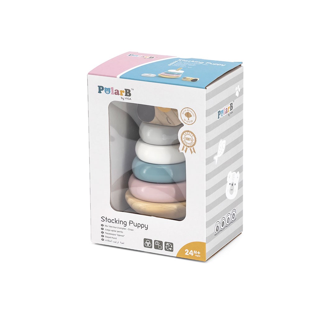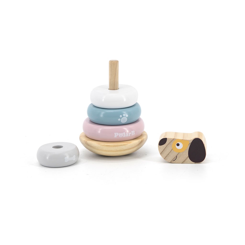 Pastelový pes je vyroben ze 6 disků-bloků různých velikostí a barev, včetně jednoho ve tvaru psí hlavy. V základně je kolíček pro umístění prvků věže. Tato hračka je ideální pro batolata, která začínají skládat kostky. Pyramida podporuje rozvoj koordinace ruka-oko, logického myšlení a navíc podporuje učení rozpoznávání barev.