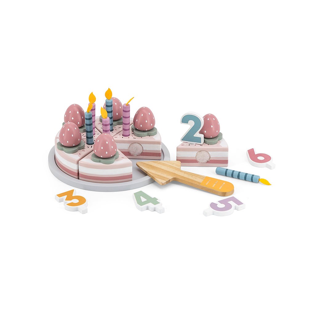 Dřevěný dort je hračka určená nejmenším dětem, které si rády hrají na oslavách a jako doplněk ke kuchyňským soupravám. Podporuje představivost a kreativitu, stejně jako sociální rozvoj a hraní rolí. Sada se skládá z 26 kostek představujících kousky dortu, jahodové ozdoby, svíčky, čísla, talíře a lopatky. Dopřejte si narozeninovou oslavu.