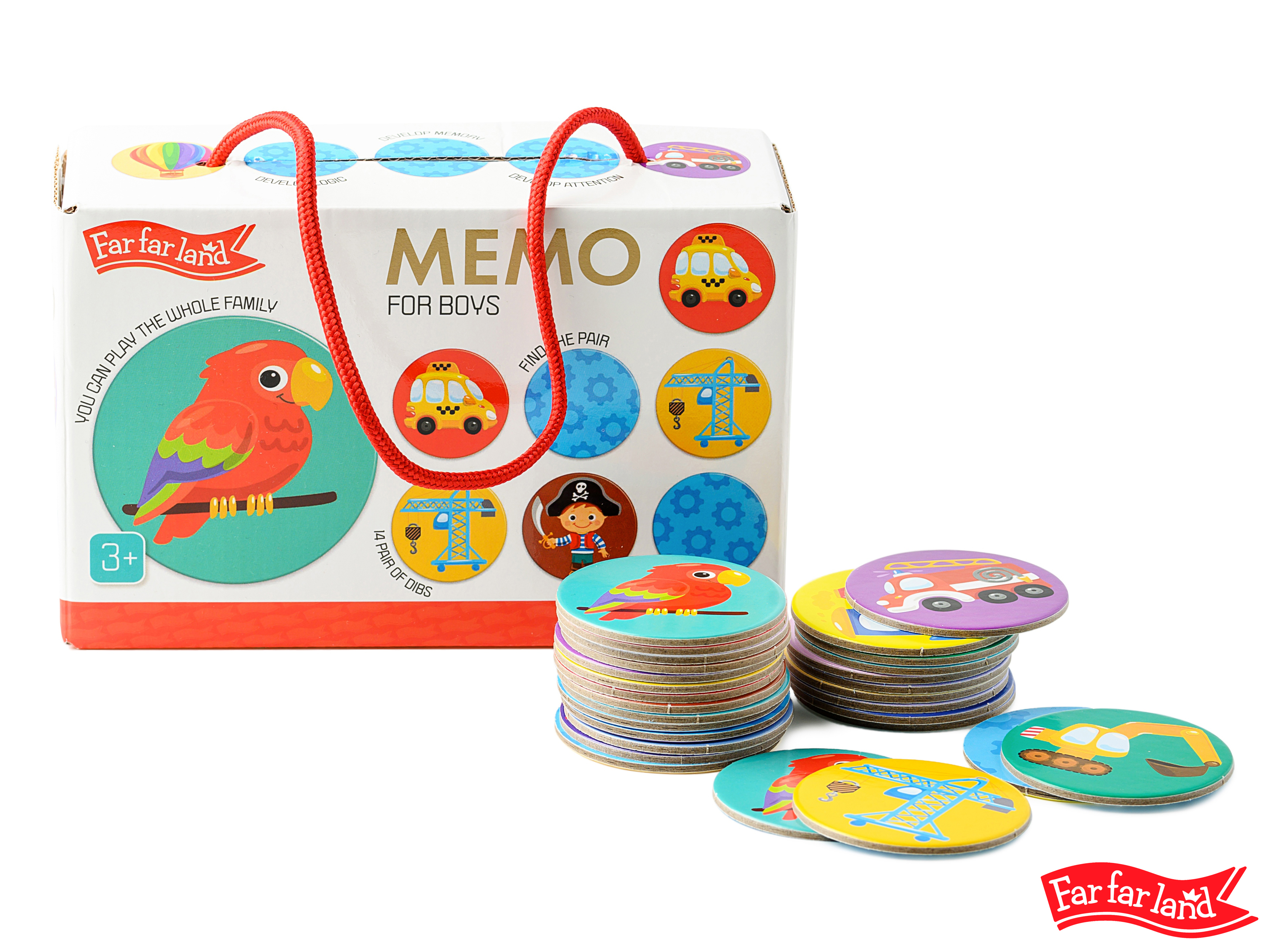 Far Far Land Pexeso kulaté pro kluky. Balení obsahuje 28 kulatých kartiček s obrázky.