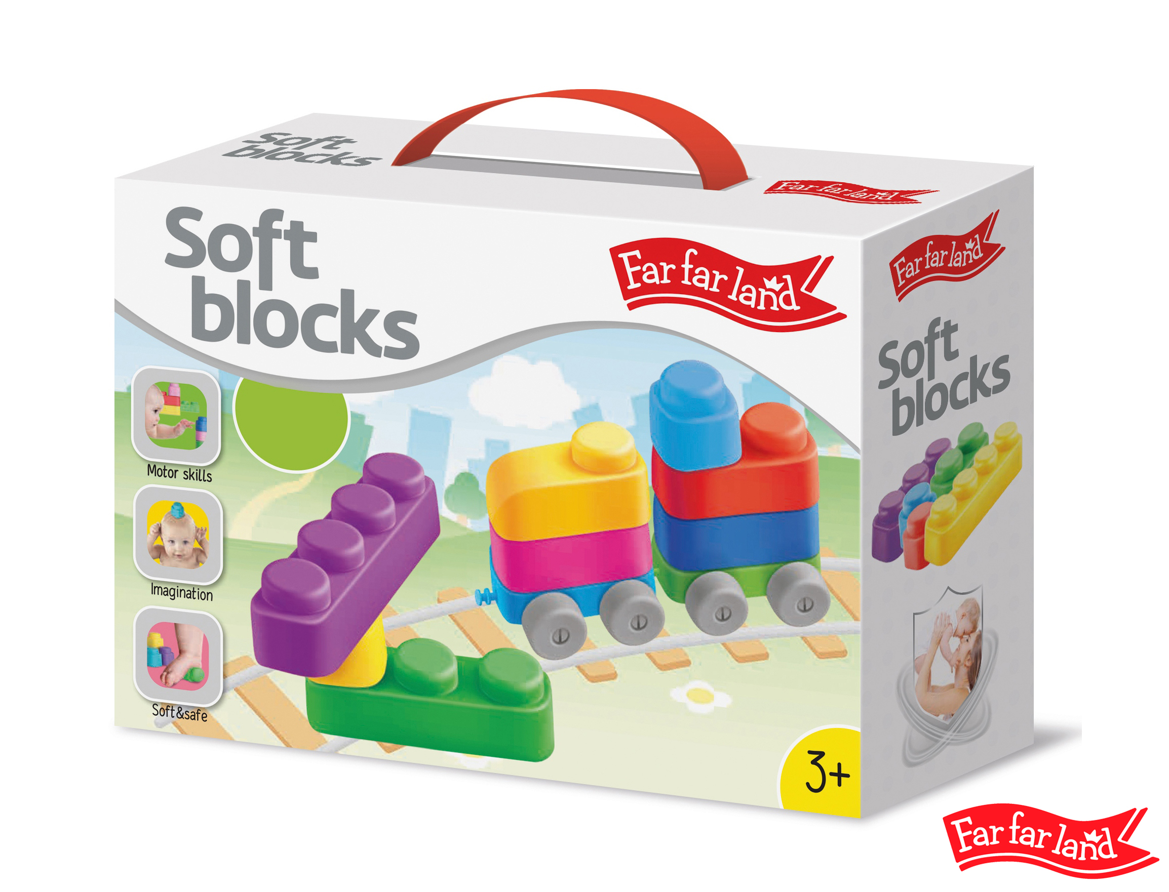 Far Far Land Stavebnice měkká. Balení obsahuje 10 dílků stavebnice a 8 koleček. Všechny bloky jsou vyrobeny s měkkého bezpečného materiálu.
