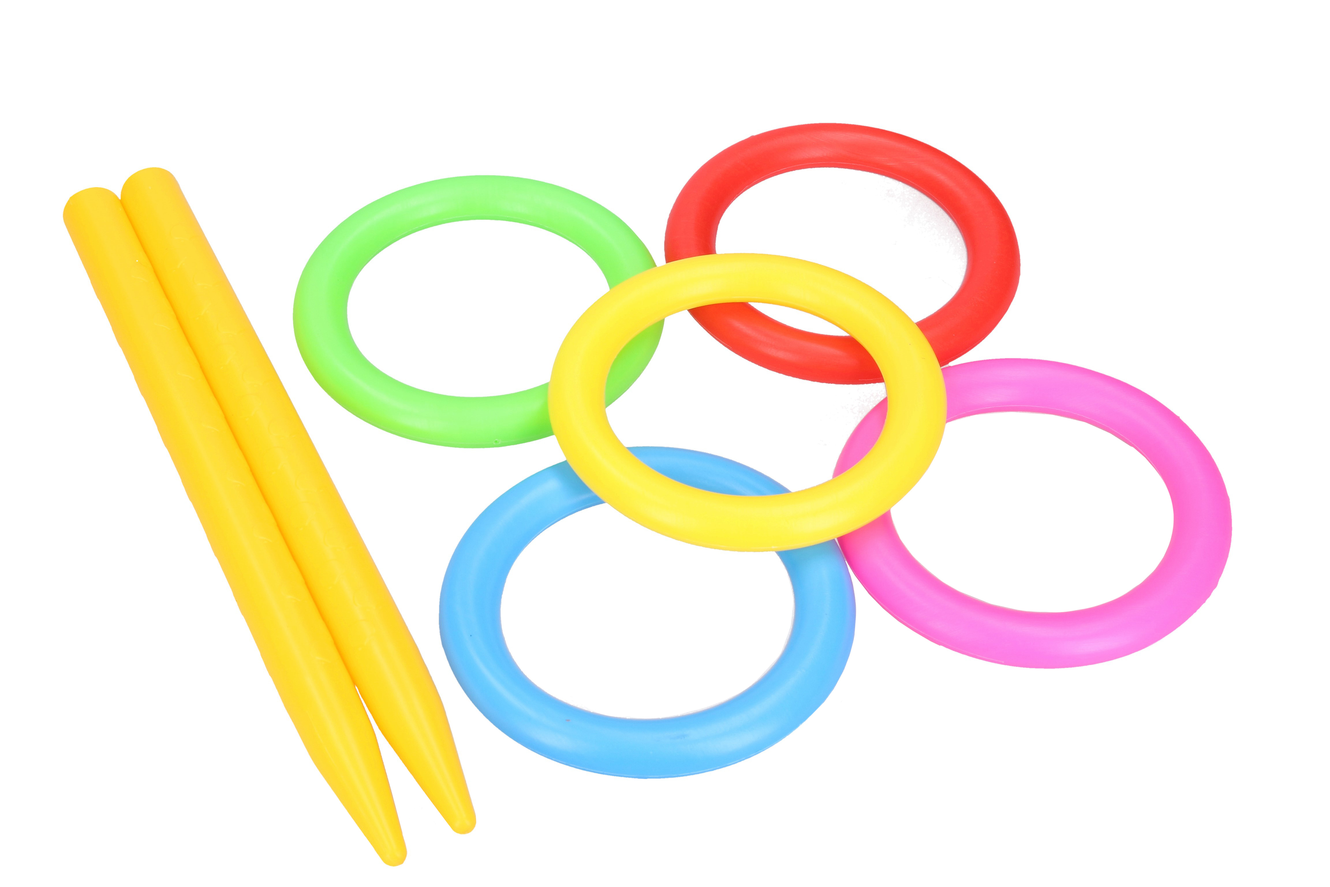 Házení kroužků set. Obsah balení - 2 x kolík (30 cm), 5 x kroužek (13 cm).