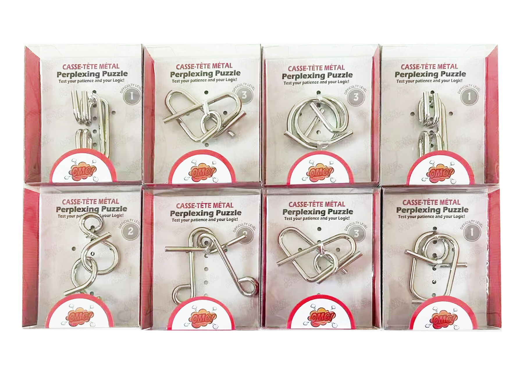 Hlavolam kovový. Přesné rozměry 10,5x8,5x2,5 cm. Display box - 24 ks. více variant
