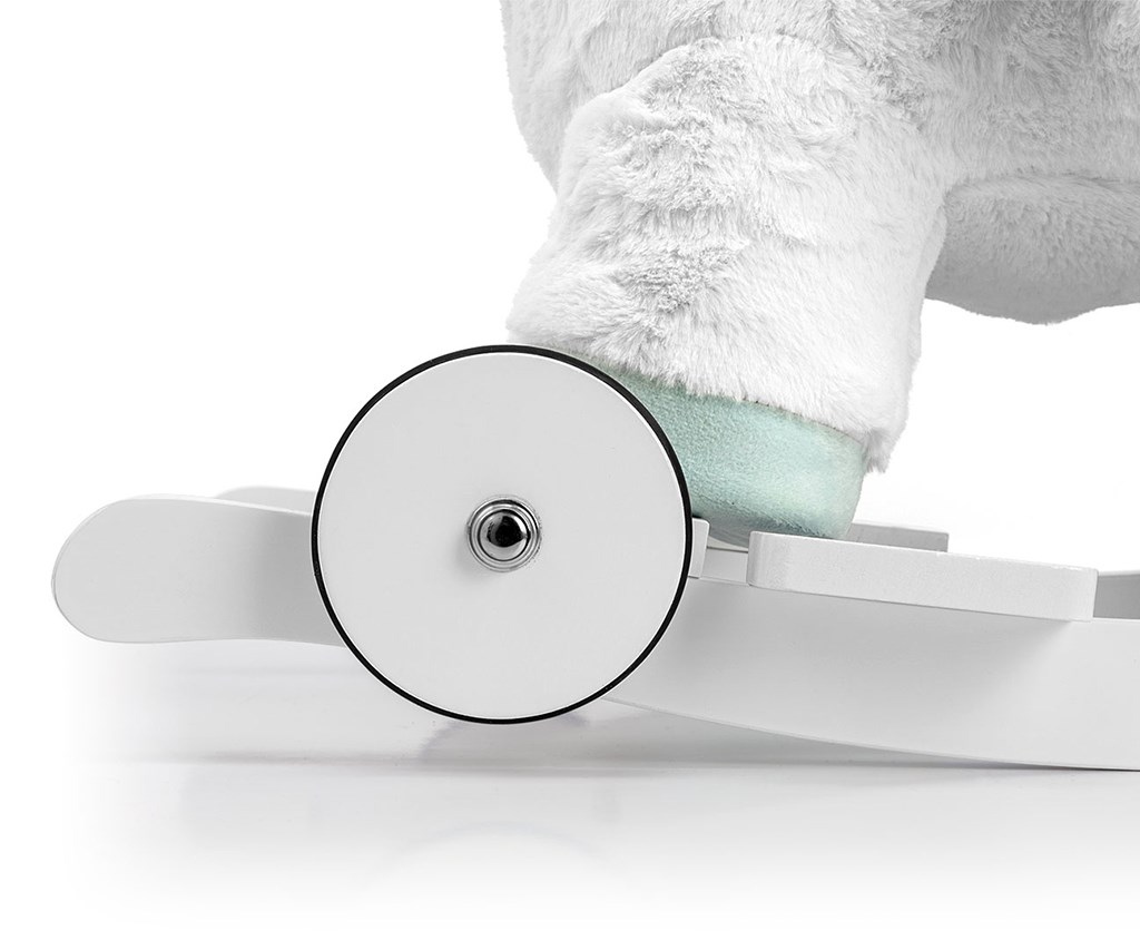 Koník má dřevěné lyžiny s opěrkami na nohy a madla, která pomáhají udržet rovnováhu při hraní, a také sadu skládacích koleček, díky kterým se během pár vteřin promění v úžasné plyšové vozítko.