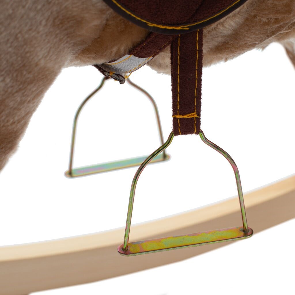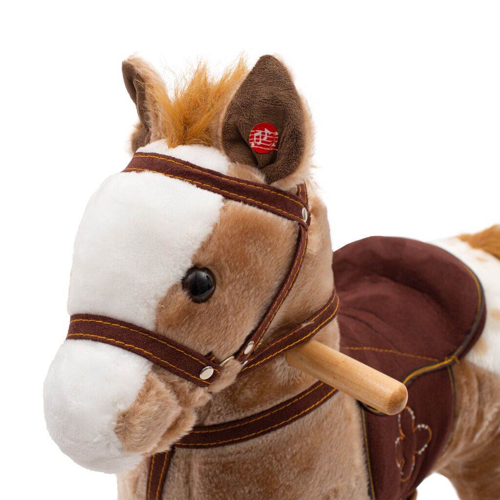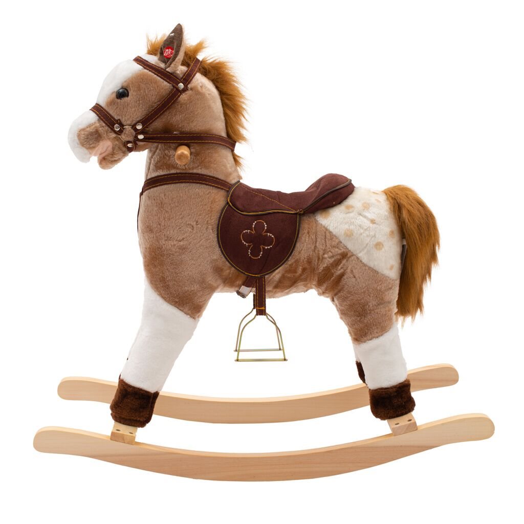 Krásný houpací koník PlayTo byl navržen pro děti, které mají rády dobrodružství. Pohodlné a ergonomicky tvarované sedlo vašemu dítěti poskytne pohodlí a bezpečnost během bezstarostného houpání. Pevné dřevěné lišty, uzda, jezdecké třmeny nebo dřevěné rukojeti pomáhají dítěti udržet rovnováhu. Houpací lišty lze navíc jednoduše odšroubovat. Celý koník je vyroben z hebkého a velmi příjemného na dotyk plyšového materiálu. Po stisknutí oušek koník pohybuje tlamičkou, vesele řechtá nebo vydává zvuky klusajícího koně. Baterie se vkládají do poudra umístěného na bříšku. Hračka pomáhá dítěti rozvíjet koordinaci pohybů a podňecuje jeho představivost.