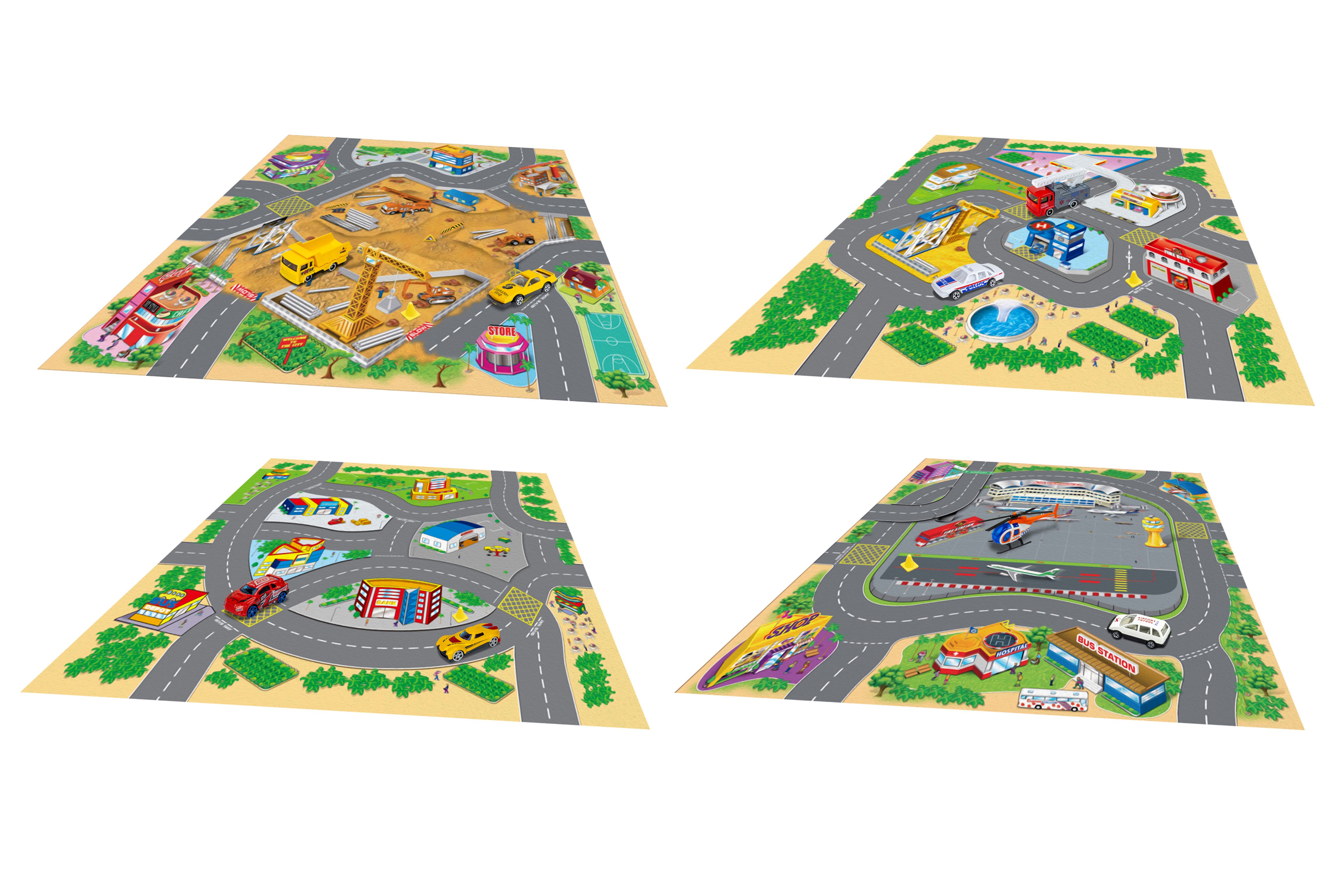 Hrací mapa s 2 dopravními prostředky. Rozměry hrací mapy 70x70 cm, dopravních prostředků 6-8 cm. Součástí textilní hrací mapa, 2 kovové dopravní prostředky. 4 varianty - záchranné složky, letiště, stavební, závodní.