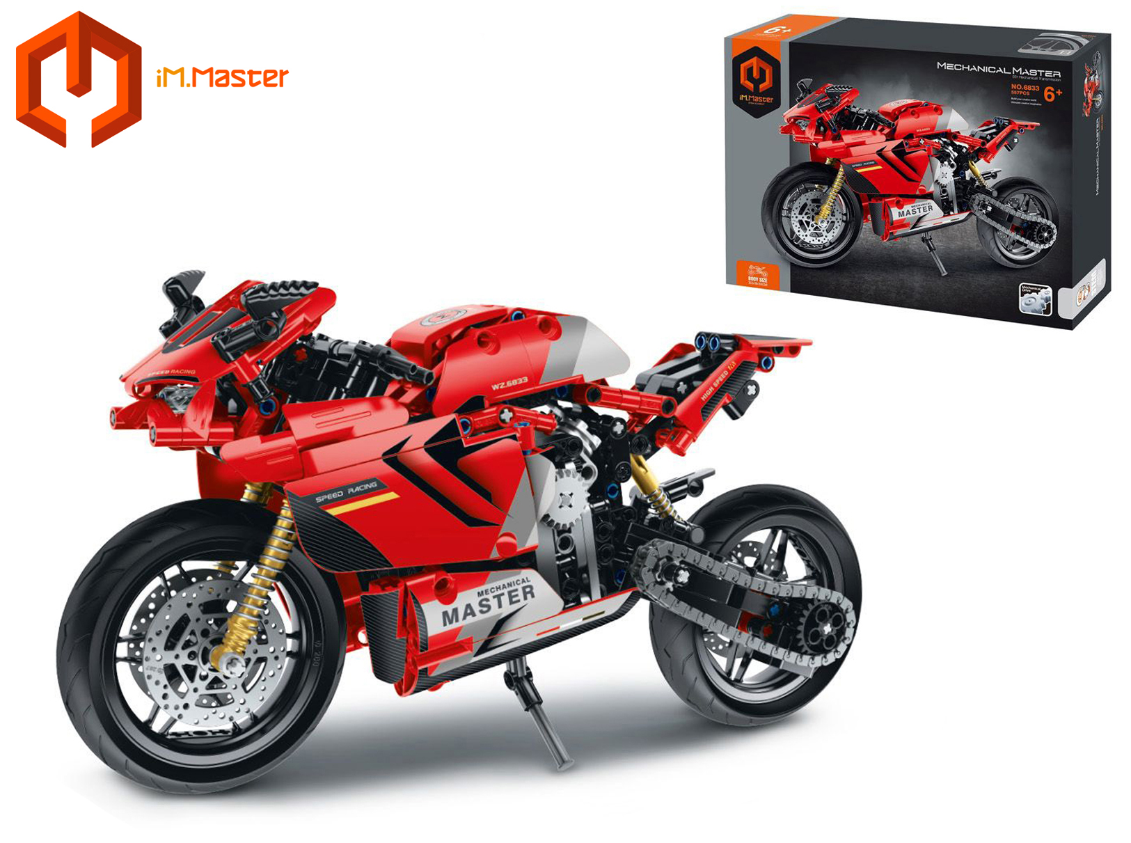 iM.Master Stavebnice motorka červená. Rozměry 32,2x10x16,6 cm. 557 dílků. Otáčecí zadní kolo s řetězem, fungující zadní tlumič.