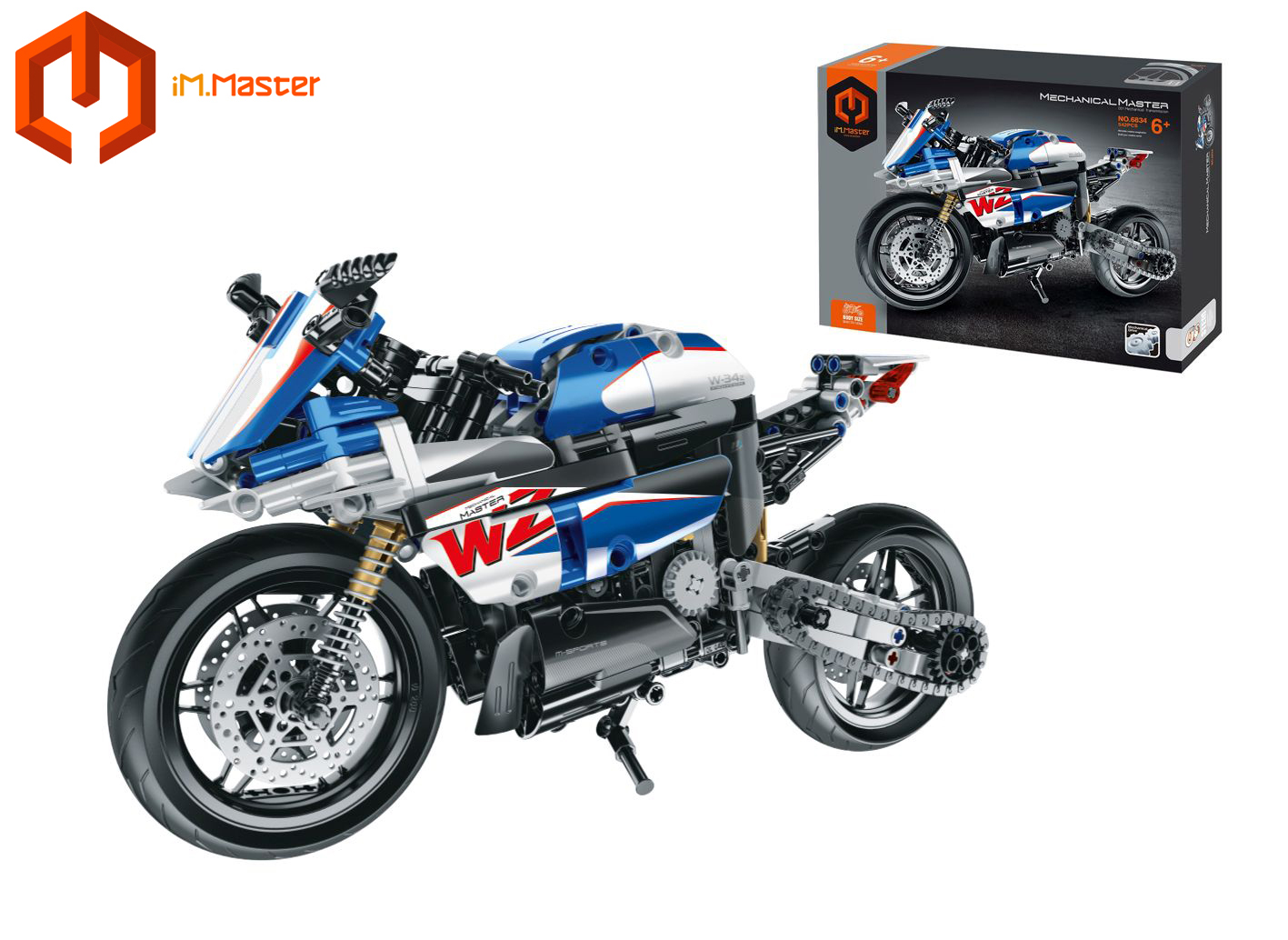 iM.Master Stavebnice motorka modrá. Rozměry 32,4x17x11 cm. 542 dílků. Otáčecí zadní kolo s řetězem, fungující zadní tlumič.