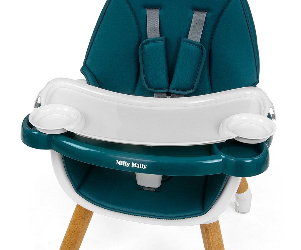 Pětibodové bezpečnostní pásy se širokými a měkkými ramenními vycpávkami chrání dítě před odřeninami. Čalounění židle Malmo z ekokůže je odolné proti znečištění a snadno se čistí. Tác má prohlubeň, která zabraňuje sklouznutí předmětů.