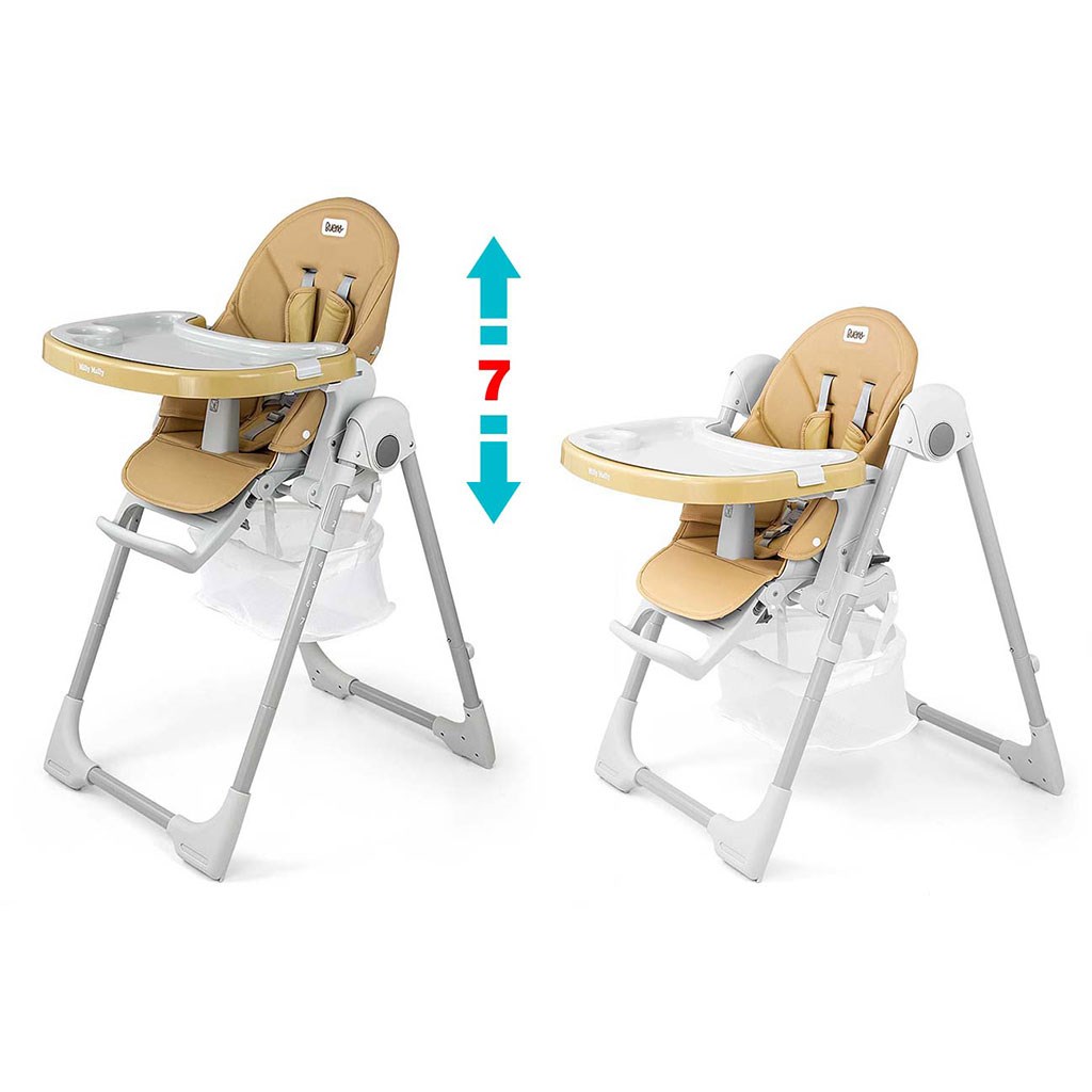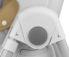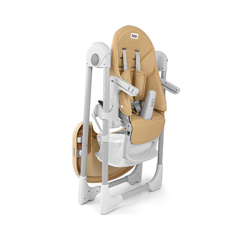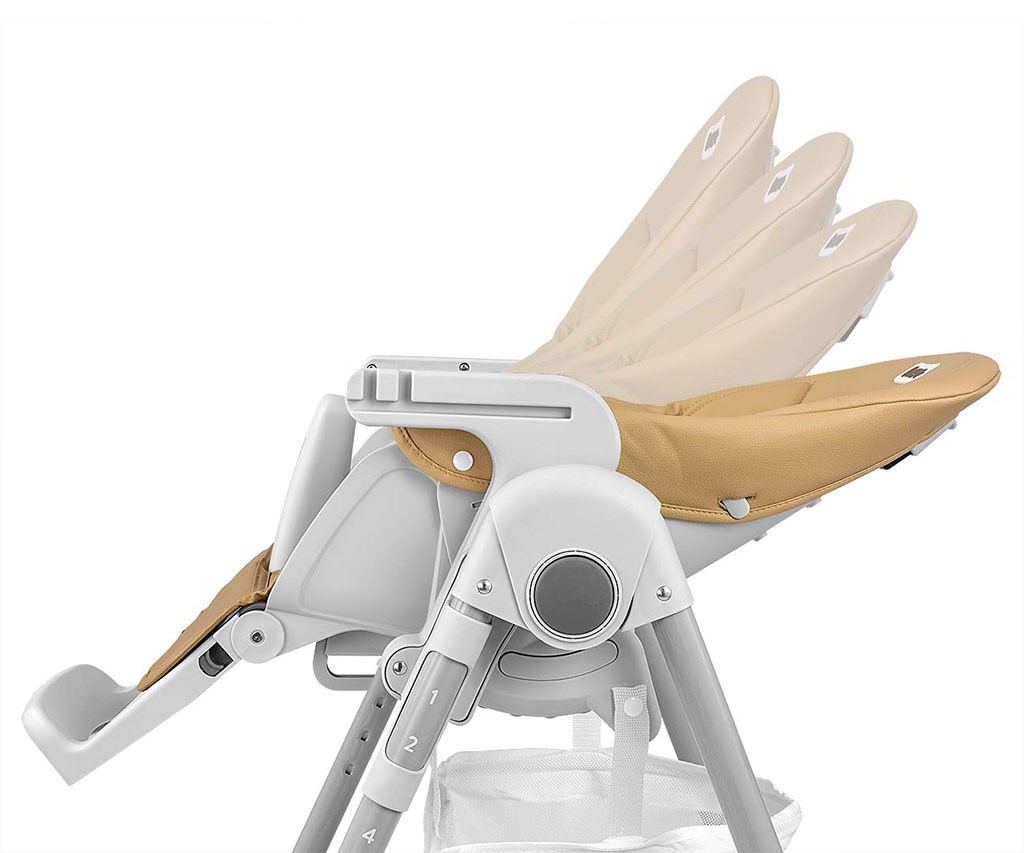 Čalounění židle je vyrobeno z ekologické kůže a má navíc měkkou vložku pro nejmenší. Pro bezpečnost dítěte je vybavena 5-ti bodovými nastavitelnými pásy a přídavnou zábranou proti uklouznutí. Na zadní straně opěradla je úchyt pro zavěšení tácu. Opěradlo i podnožku lze sklopit do lehu. Sedák lze zvednout nebo snížit v 7 stupních a nohy mají zabudovaná gumová kolečka. Celou konstrukci lze snadno a hladce složit.