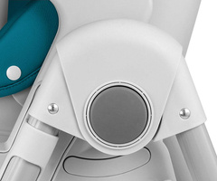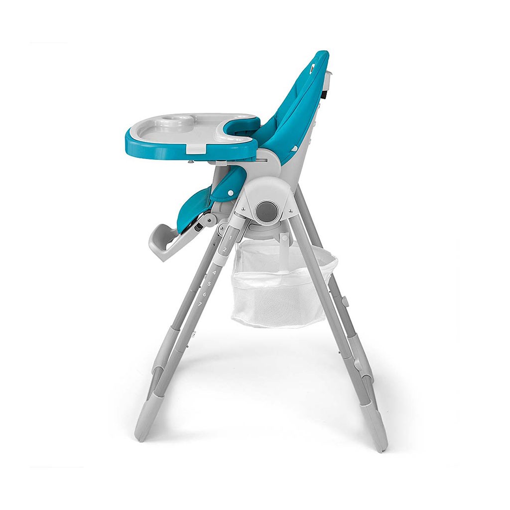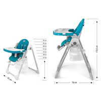 Čalounění židle je vyrobeno z ekologické kůže a má navíc měkkou vložku pro nejmenší. Pro bezpečnost dítěte je vybavena 5-ti bodovými nastavitelnými pásy a přídavnou zábranou proti uklouznutí. Na zadní straně opěradla je úchyt pro zavěšení tácu. Opěradlo i podnožku lze sklopit do lehu. Sedák lze zvednout nebo snížit v 7 stupních a nohy mají zabudovaná gumová kolečka. Celou konstrukci lze snadno a hladce složit.