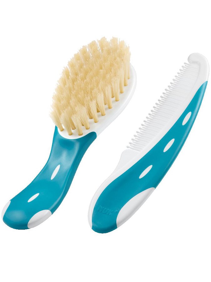 Kartáček a hřebínek Nuk. Kartáček na vlasy z jemného přírodního vlákna s hřebínkem. Kartáček jemně masíruje pokožku hlavy miminka, a tak podporuje prokrvení pokožky a posiluje vlasy a upravuje je. Hřebínek má zaoblené okraje, což usnadňuje péči o dítě. Protiskluzová rukojeť zaručí pohodlné držení hřebínku i kartáčku. Vhodné pro děti od narození.