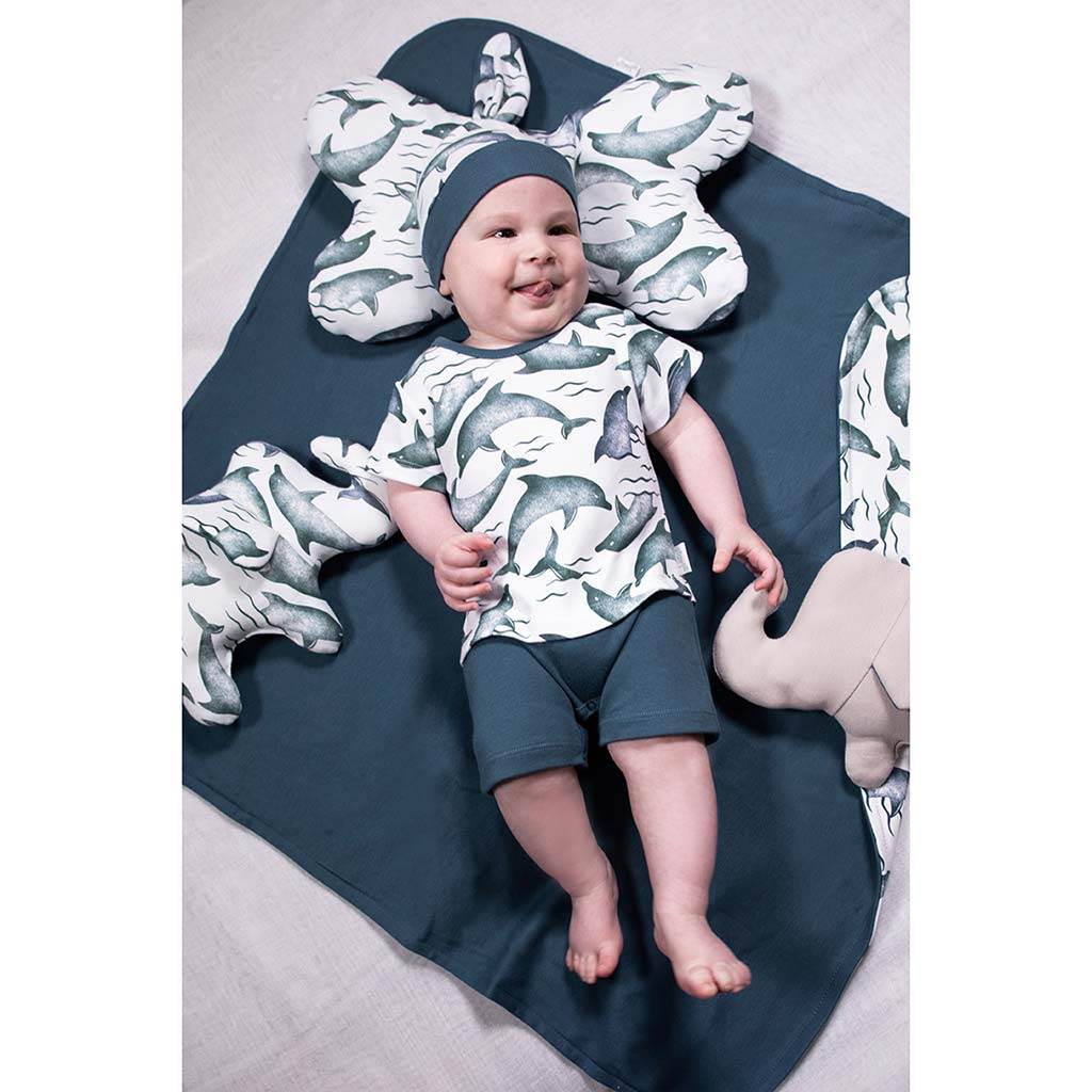 Krásná bavlněná kojenecká čepička-šátek Nicol Dolphin. Čepička je ušitá ve stylu šátku s pružným lemem s potiskem delfínů. Díky příjemnému a kvalitnímu materiálu se miminko bude cítit velmi příjemně a pohodlně. Složení: 100% bavlna.