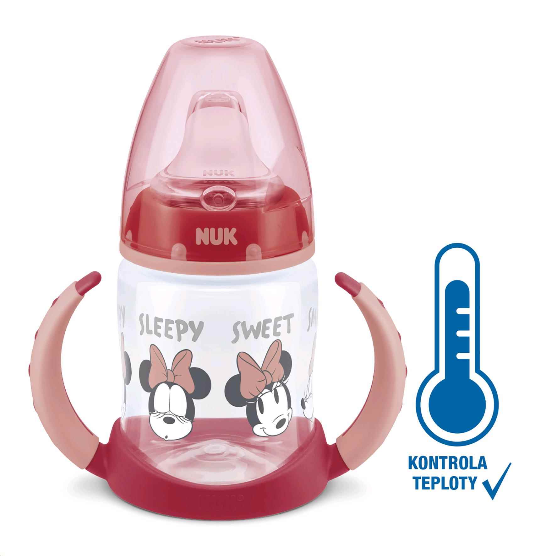 Kojenecká láhev na učení NUK First Choice s kontrolou teploty. Zabudovaný indikátor kontroly teploty změní barvu, pokud je obsah lahvičky příliš horký. Modrá barva indikátoru se změní na bílou. Lahvička miminkům usnadňuje přechod od kojení nebo krmení k samostatnému pití. Kojenecká láhev má měkké silikonové nekapající pítko a nemusíte se bát vylití obsahu. Je ergonomicky tvarovaná a má protiskluzová držátka, takže si dítě může láhev držet samo například i při jízdě v kočárku. Výhodou této super lahvičky je, že se snadno rozmontujete a čistí. Vyrobená z vysoko kvalitného plastu polypropylénu a neobsahuje BPA (Bisfenol A). Vhodné pro děti od 6 do 18 měsíců. Klinicky testováno. Balení obsahuje: