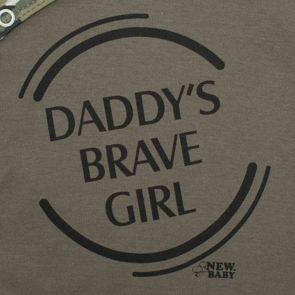 Stylové bavlněné kojenecké dupačky české značky New Baby Army pro miminka. Dupačky jsou zdobené lemováním s maskáčovým vzorem a nápisem DADDY´S BRAVE GIRL. Zapínání na cvočky na ramínkach a mezi nožičkami usnadňuje oblékání a přebalování. Dupačky jsou pro miminka důležitým kouskem oblečení. Při jakémkoliv pohybu jsou zádička miminka stále přikrytá.