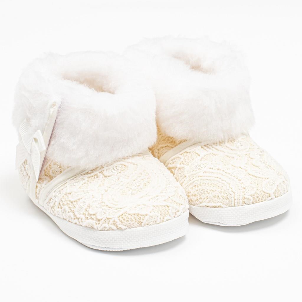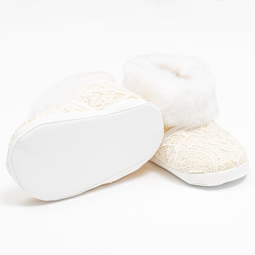 Kojenecké zimní capáčky New Baby pro miminka. Krásné, teplé krajkové kozačky na suchý zip. Vnitřní část je vystlaná rounovou pleteninou-100% polyester. Capáčky přiléhají k nožičce a mají široký vnitřek, což umožňuje volný pohyb prstů a svalů. Výrobek není určen k chůzi. Jsou velmi lehké s tenkou syntetickou podrážkou. Složení: 100% polyester, rounová pletenina-100% polyester. Podrážka: syntetický materiál PVC bez BPA. Délka vnitřní stélky 10 cm. Určeno pro děti 0-3 měsíců. Dodáváné v praktické krabičce. Upozornění: pod textilní vložkou se někdy nachází papírová vložka, která drží tvar capáčky. Před prvním použitím odstraňte tuto papírovou vložku.