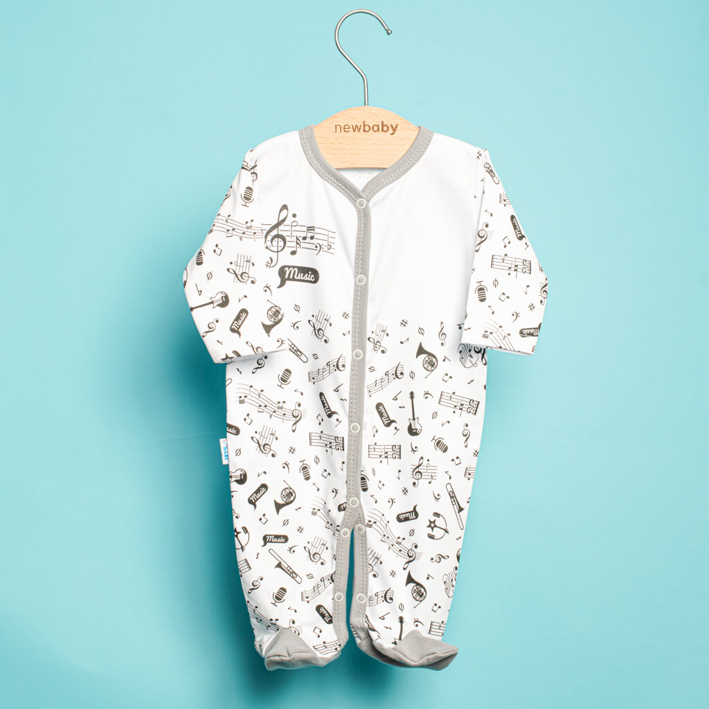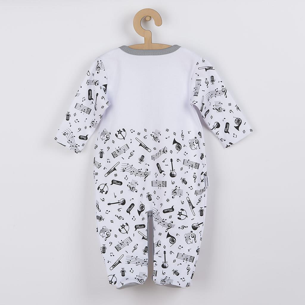 Originální, hravý a zároveň veselý bavlněný kojenecký overal New Baby Music pro miminka. Dětský overálek má rukávky a spodní část celopotištěnou notičkami a hudebními nástroji. Vrchní část je zdobena roztomilým obrázkem notiček a nápisem Music. Zapínání na cvočky po celé délce a mezi nožičkami usnadní oblékání a přebalování. Díky nápaditému designu bude děťátko v overálku velmi originální. Klademe důraz na kvalitu a proto se díky příjemnému, měkkému a kvalitnímu materiálu, bude Vaše miminko cítit velmi příjemně. Náš overálek je vhodný pro kluky i holčičky. Složení: 100% bavlna. Rozměry: obvod kolem hrudníku cca 46 cm, celková délka cca 45 cm, délka od rozkroku cca 15 cm, délka rukávú cca 17 cm.