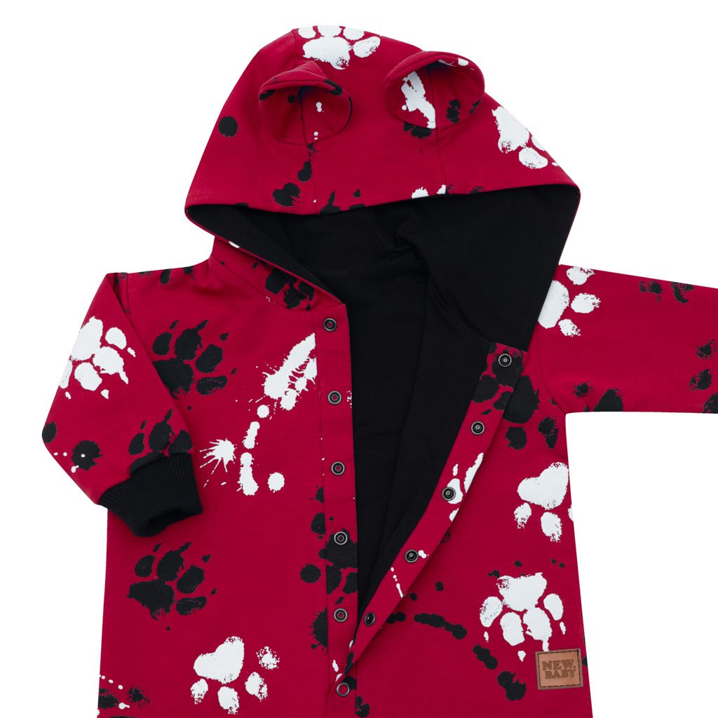 Nápaditý bavlněný kojenecký overal české značky New Baby Paw. Overal je celopotištěný dětským vzorem. Je vyroben z kvalitního bavlněného materiálu s elastanem a bavlněnou podšívkou. Materiál je hladký a příjemný na dotek. Praktické zapínání na cvočky po celé délce velmi usnadní oblékání a přebalování. Overal má praktickou kapuci s oušky, širší pružné lemy na rukách a nohavičkách a celá vnitřní strana je zateplená bavlněnou podšívkou, která zvyšuje komfort nošení. Miminko se bude cítit v overálku velmi pohodlně a příjemně. Složení: 95% bavlna, 5% elastan, podšívka- 95% bavlna, 5% elastan. Vhodné na jaro a na podzim.