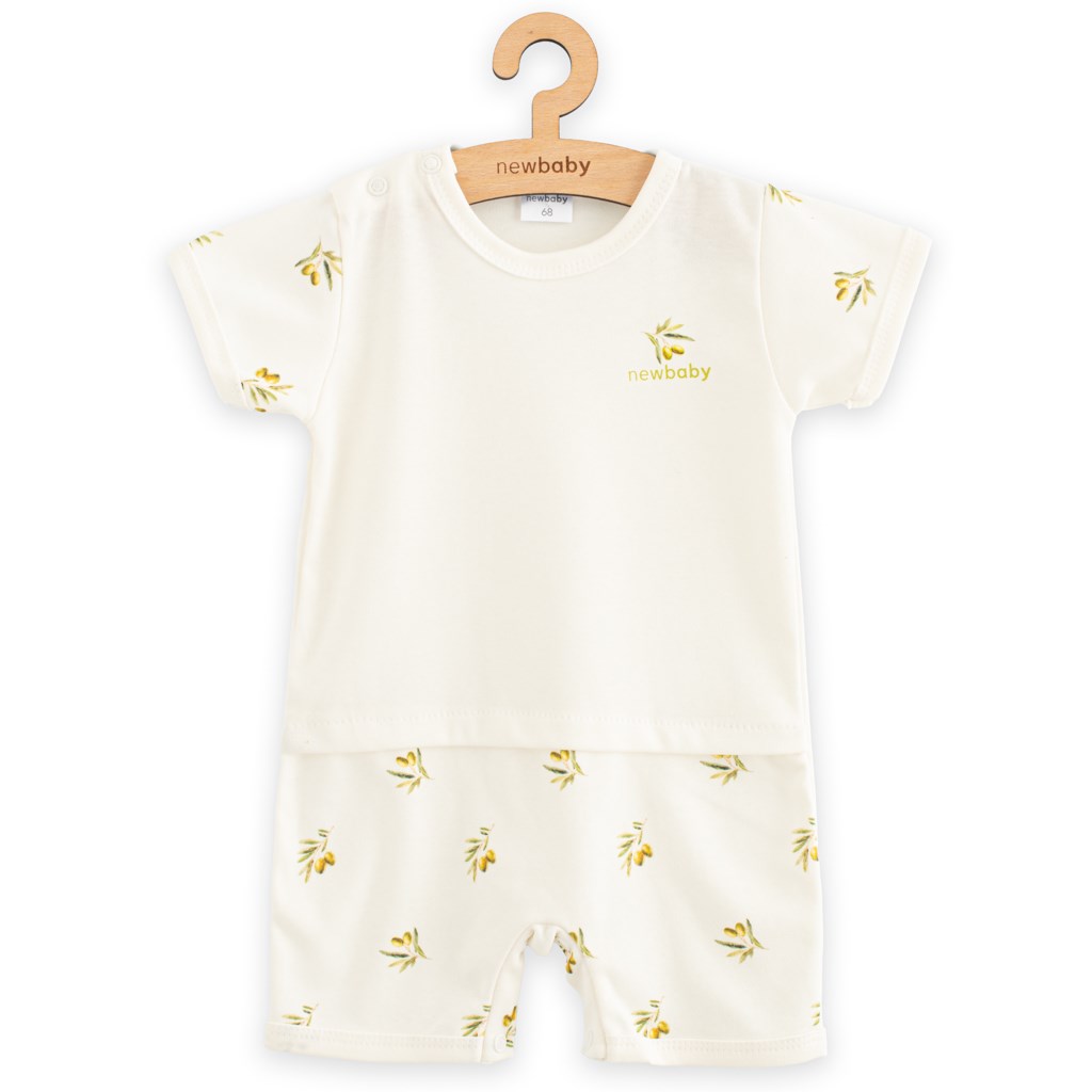 Stylový letní overal s krátkým rukávem české značky New Baby Olivy. Zavinovací overálek s krátkým rukávem je celopotištěný krásnými olivami. Má praktické zavazování na boku na tkaničky, z vnitřní strany na cvoček a mezi nožičkama na cvočky což usnadní oblékání a přebalování. Na nohavičkách jsou jemné gumičky, které ale netlačí na nožičkách. Super stylový letní overálek rozzáří každé miminko