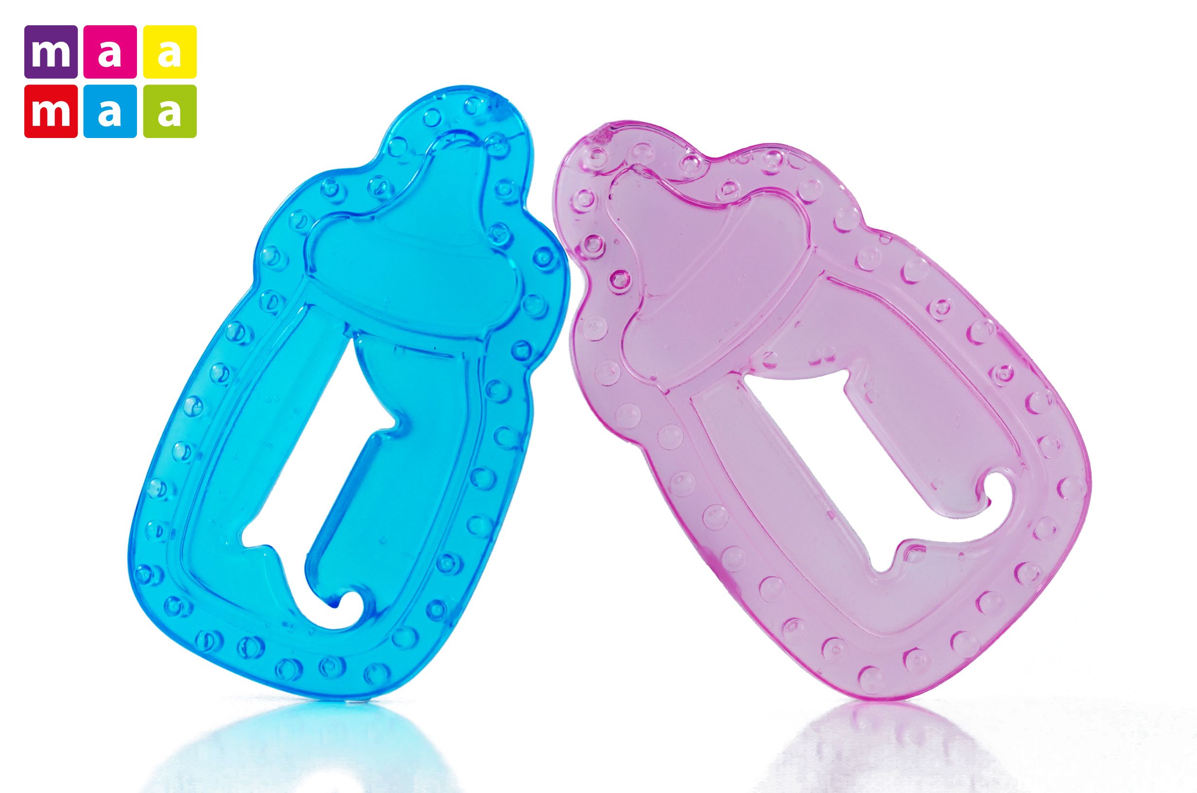 Chladící kousátko ve tvaru láhve je dodáváno ve dvou barevných provedeních - modrá a růžová. Kousátko je vyrobeno z měkkého materiálu, je plněný nezávadným gelem. Skvělá stimulace bolavých dásní.