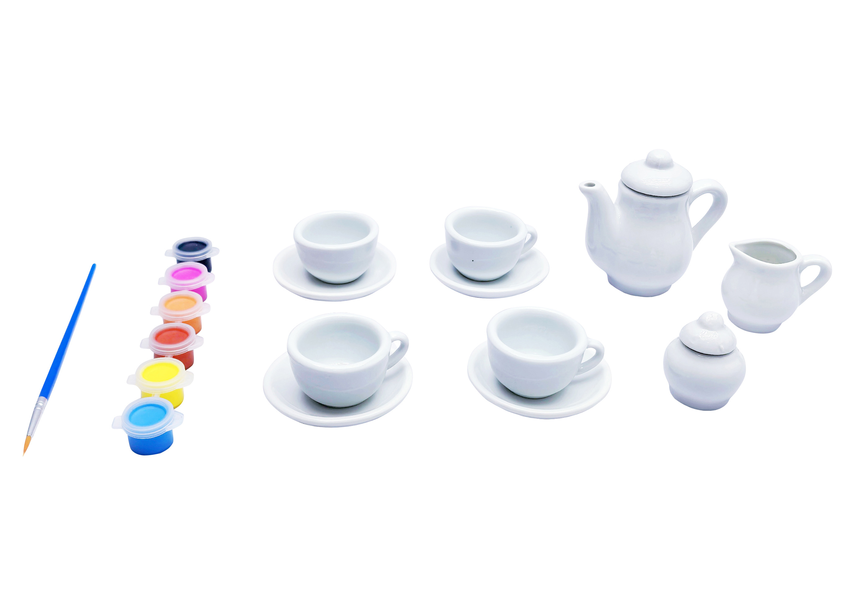 Kreativní set malování čajové soupravy. Obsahuje 6 barev, štětec, 4 hrnečky s podšálky, konvičku, cukřenku. Velikost konvičky 8x8x4cm.