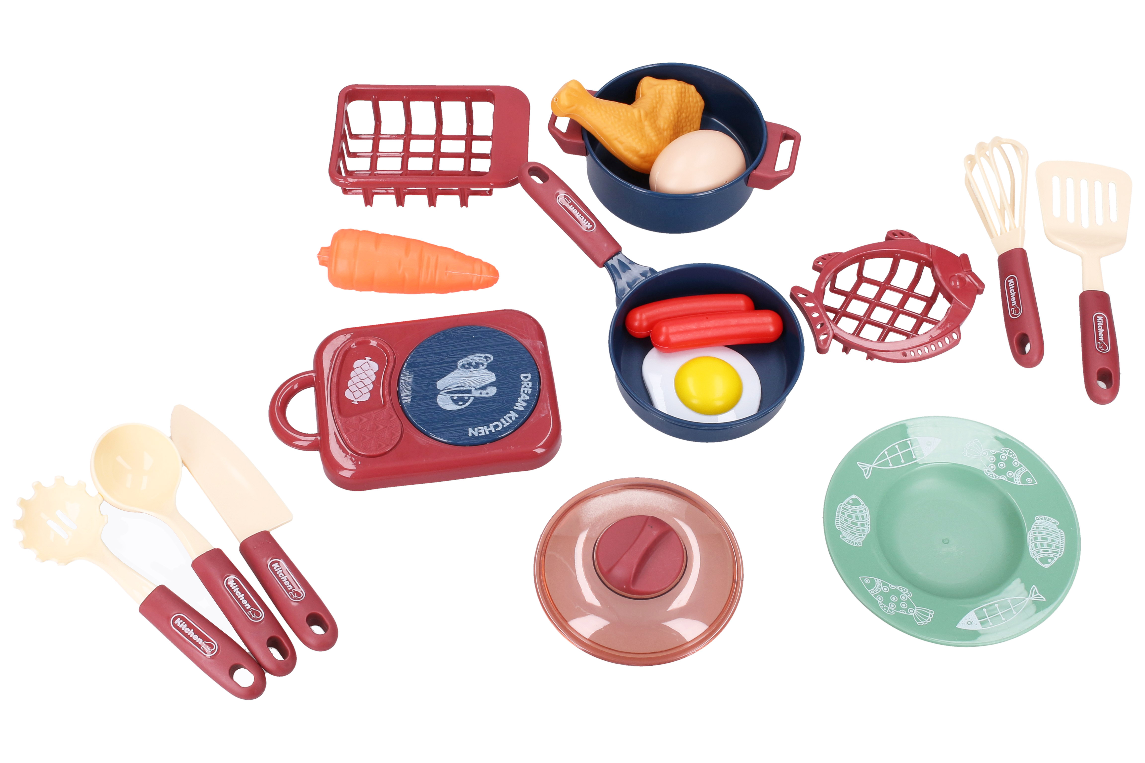 Kuchyňský set. Součástí vařič, nádobí a jídlo.