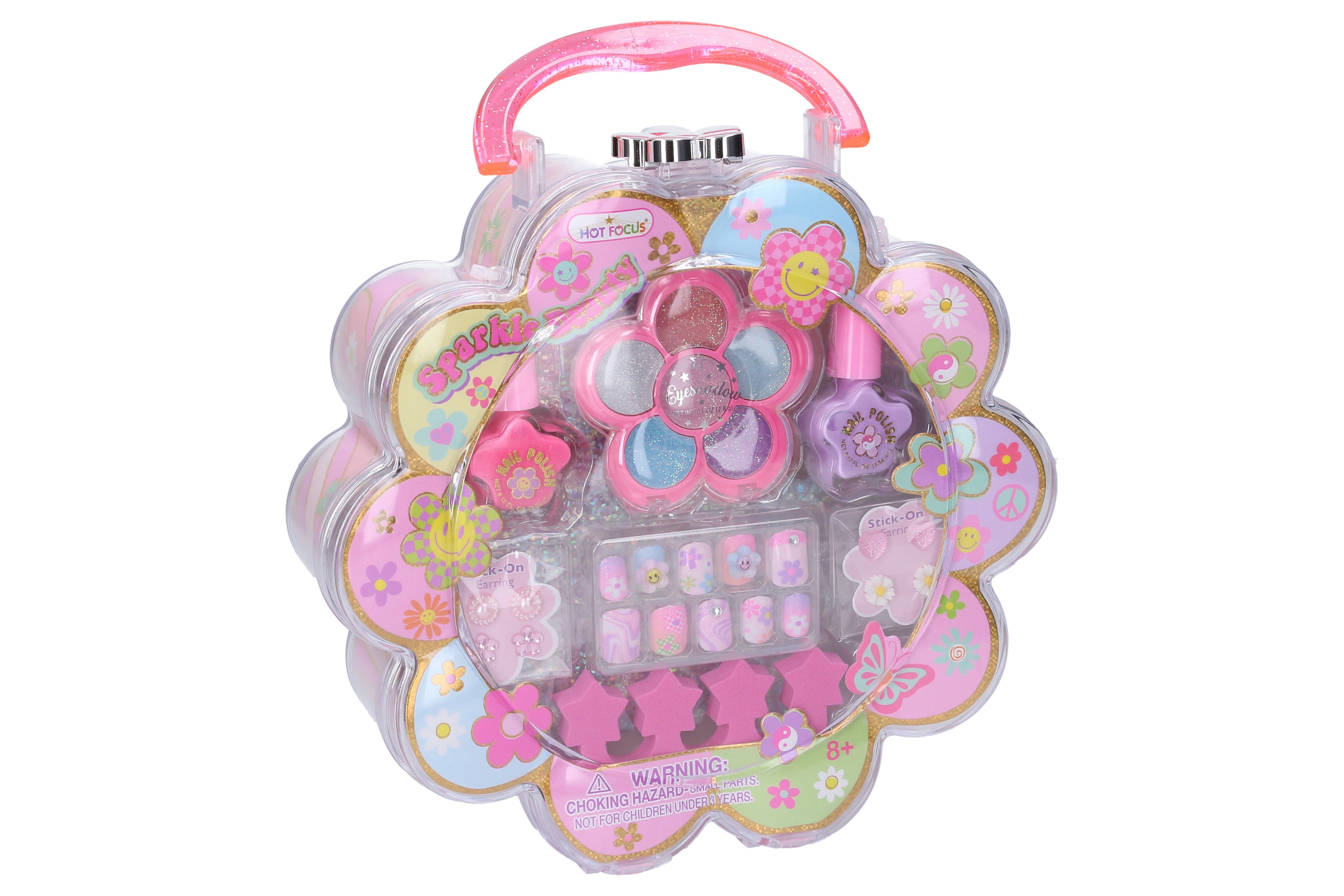 Kufřík s kosmetikou - kytička. Velikost 20cm. Obsahuje umělé nehty 10ks, laky na nehty 2 ks, oční stíny, nalepovací náušnice 8 ks, oddělovač prstů.