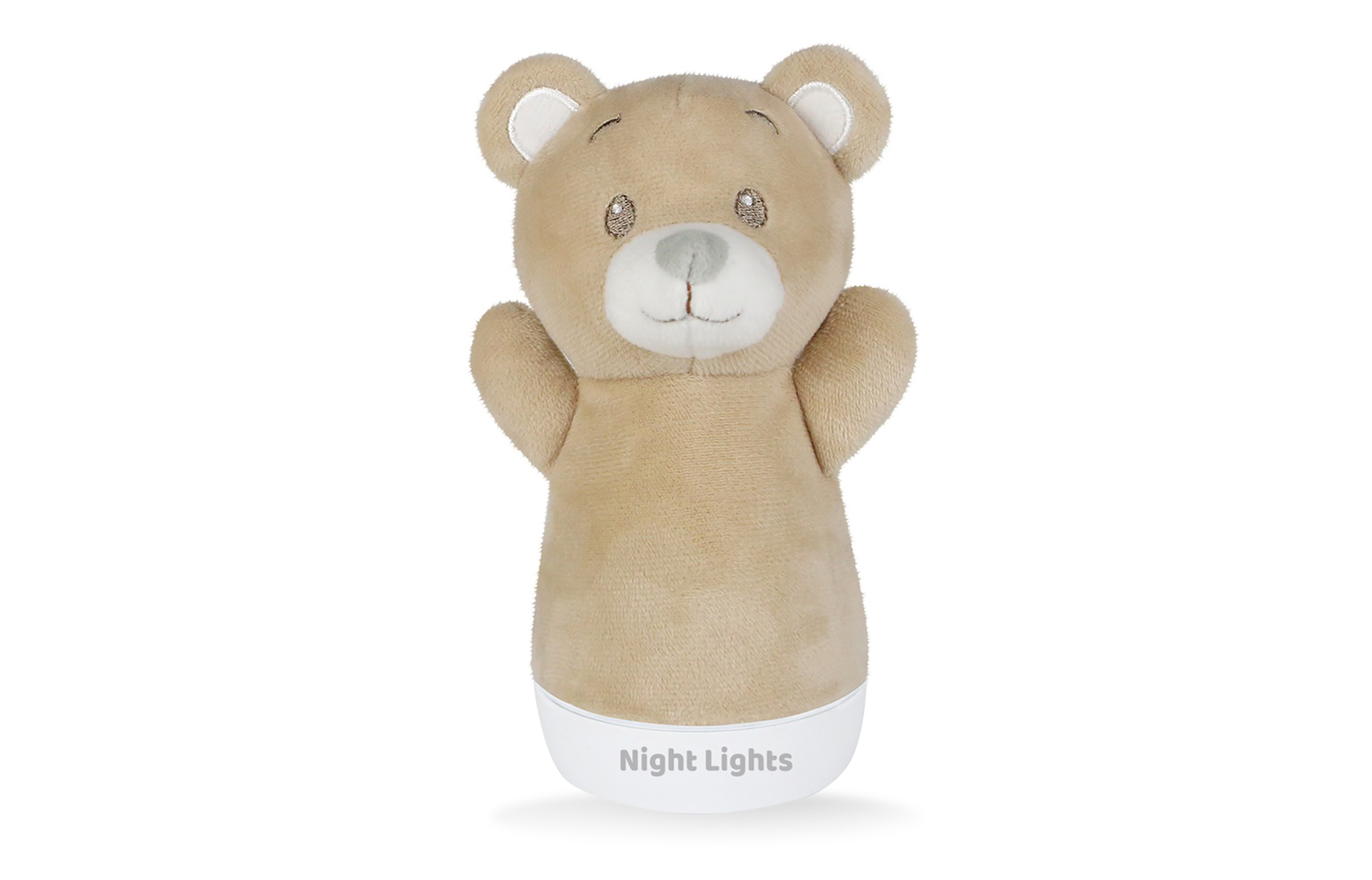 Lampička noční medvídek usínáček plyšový. Rozměry 11x8x15,5 cm. Aktivace přepínačem na spodní straně lampičky. Automaticky se měnící barevné světýlko (7 barev). 3xAAA baterie, nejsou součástí.
