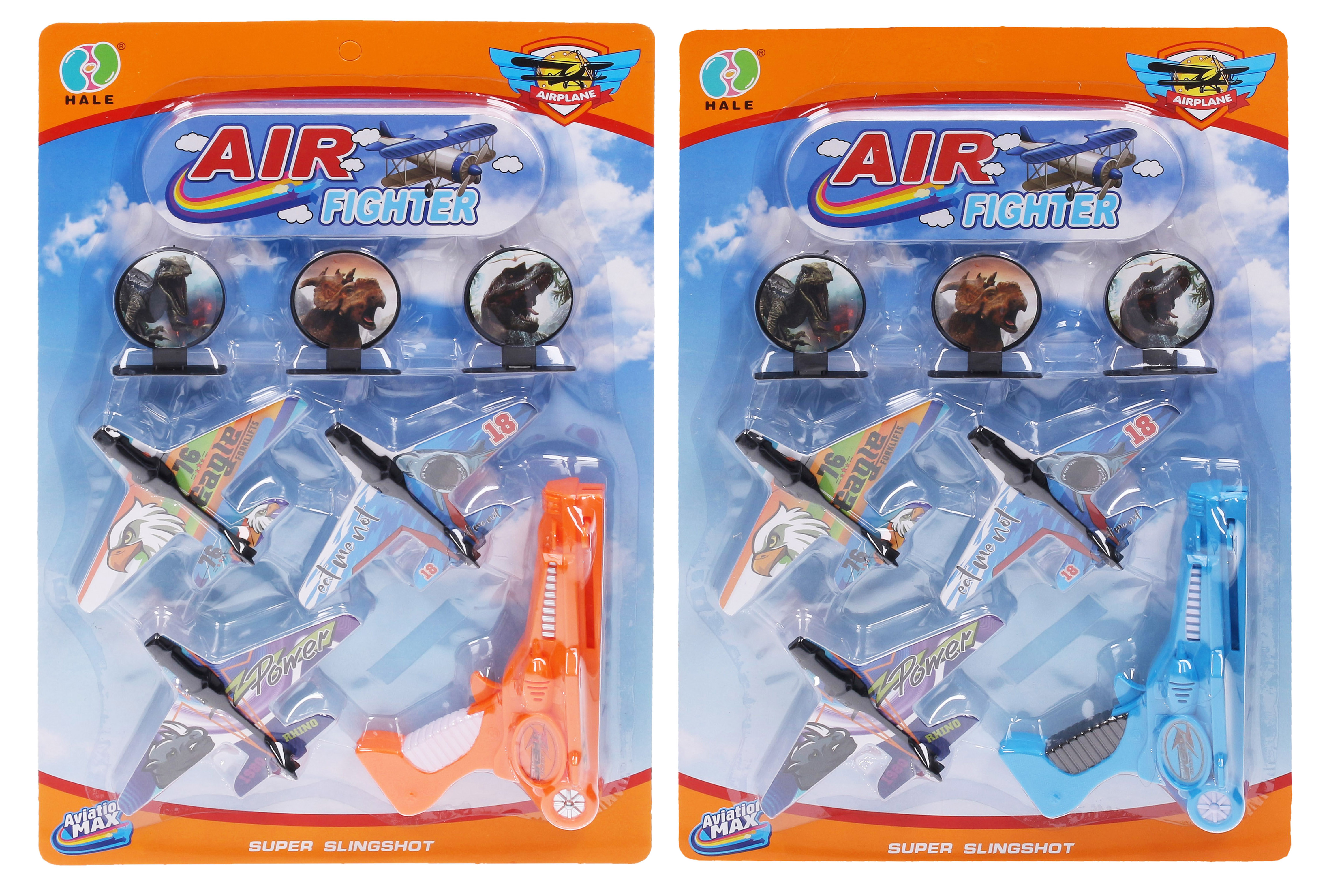 Letadla vystřelovací 3 ks. Rozměry letadla 14,5x9,5 cm, pistole 17x5,5x15 cm. 2 varianty pistole - modrá, oranžová.