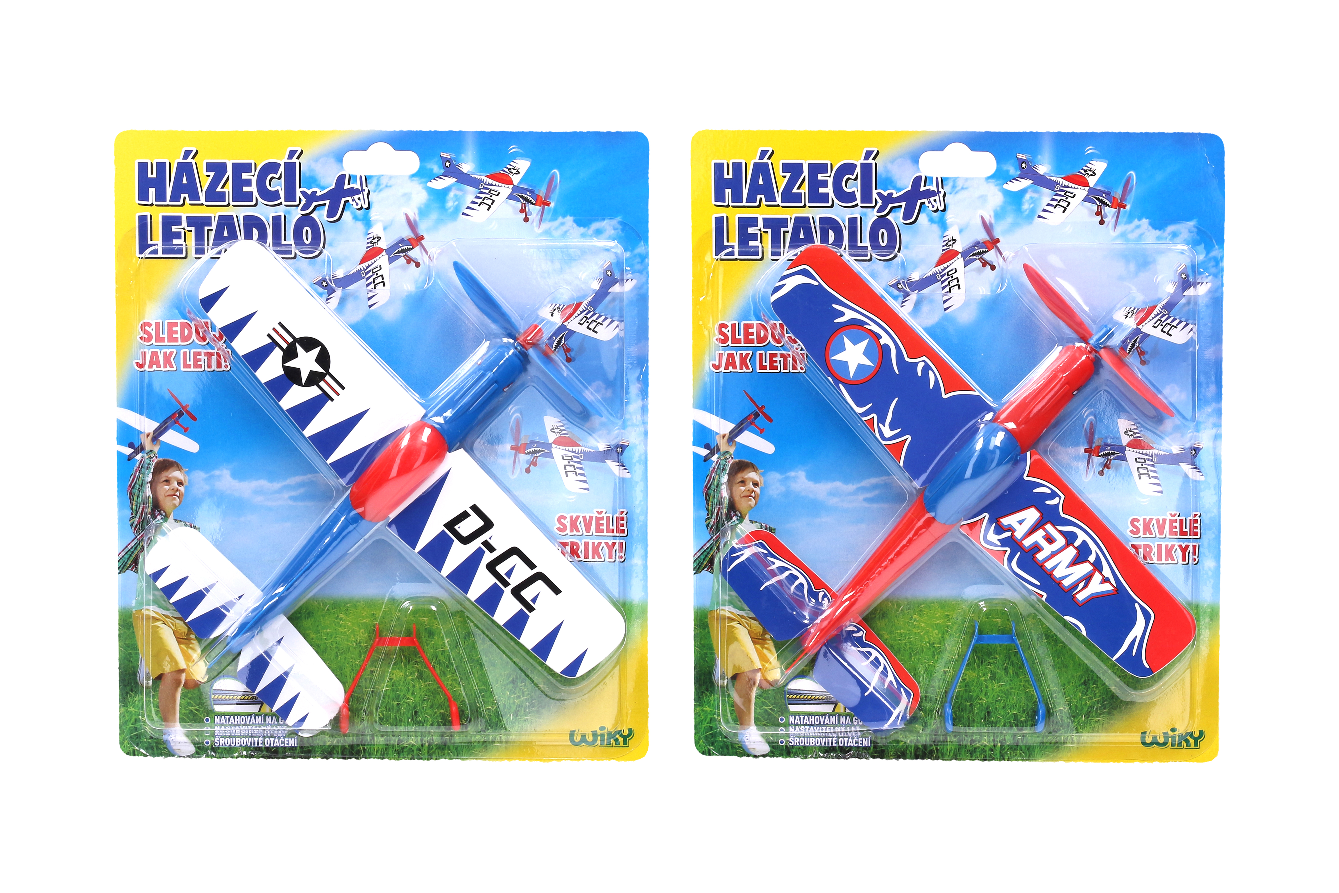 Letadlo na natáhnutí. Délka 21,5 cm, rozpětí křídel 21,5 cm. 2 varianty - modrá, bílá.